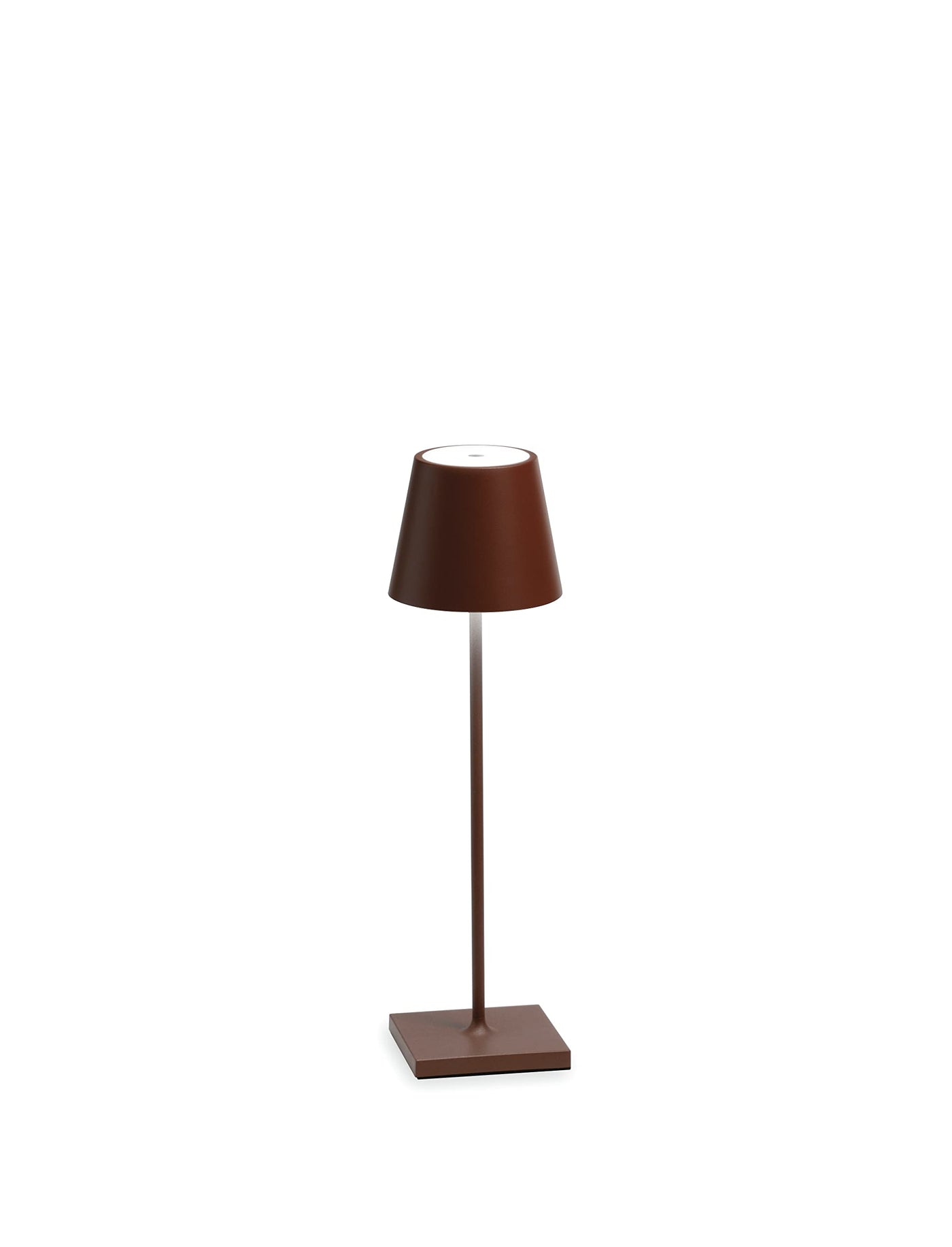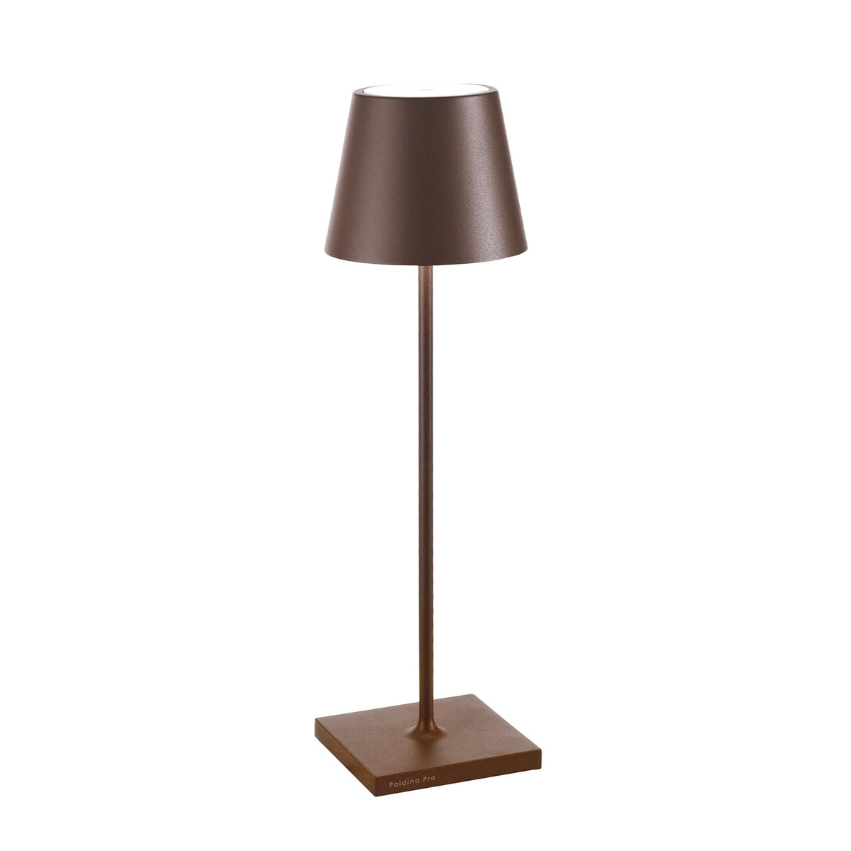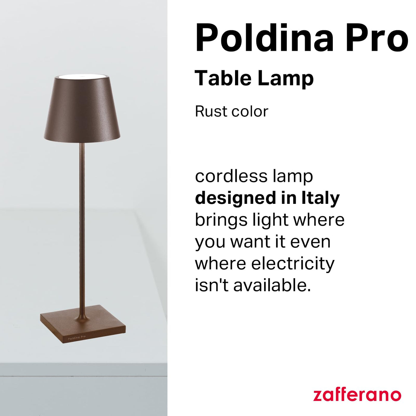 Q: What are the key features of the Zafferano Poldina Pro Lamp?A: The Zafferano Poldina Pro Lamp features a modern design with a rust-colored powder coating, a polycarbonate diffuser, and LED light sources. It includes touch controls for easy operation, is rechargeable with a battery life of over 12 hours, and has a high protection index (IP65) for outdoor use.