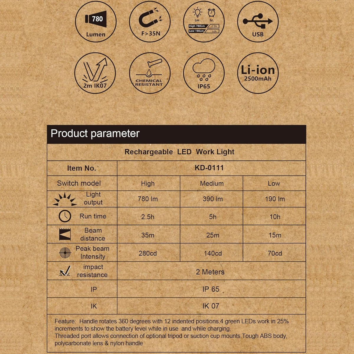 The Zasleme Cyclopia Work Light,Use Convex Lenses Illumination Even Brighter. Usb-C Rechargeable Work Light That Fits Nicely In Your Hand, But It Also Has A Handle With A Built In Magnet And A 1/4''-20 Tripod Socket The Handle Rotates 360 Degrees, With 12 Intended Positions. Cyclopia Work Light Have 3 Brightness Settings: 780 Lumens On High With A Run Time Of 2 Hr, 360 Lm On Medium With A Run Time 5 Hr And 190 Lm On Low With A Run Time Of 10 Hr.
