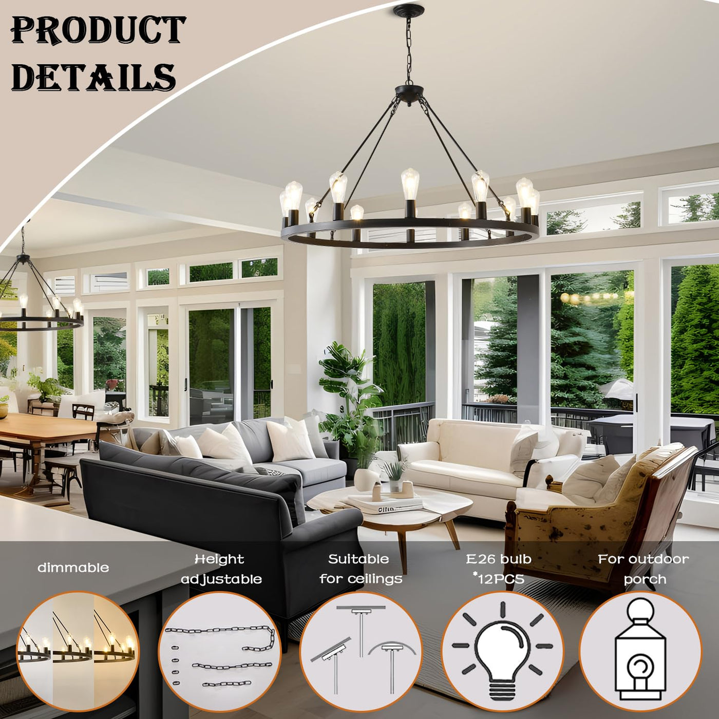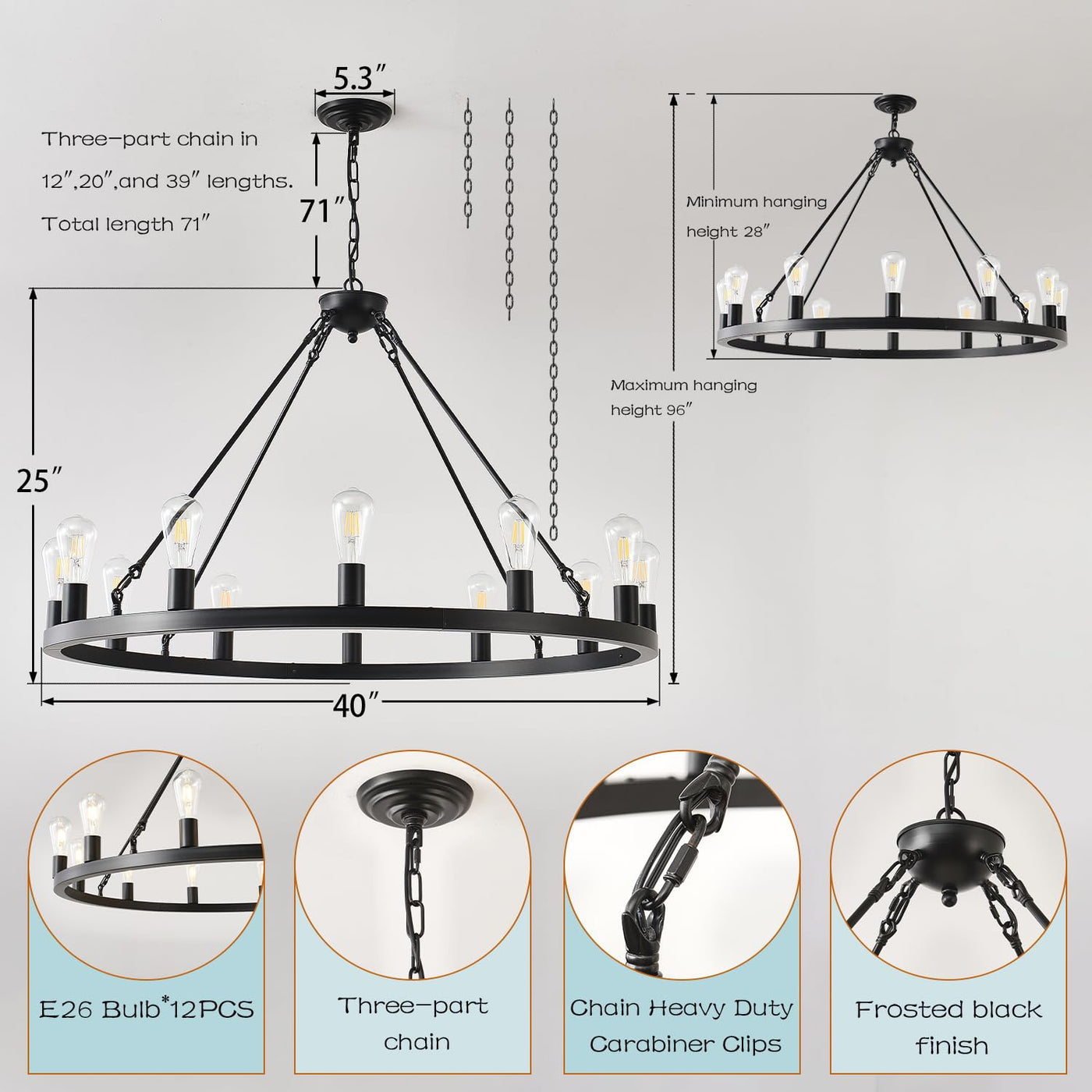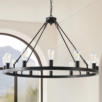 40 Black Wagon Wheel Chandelier,Farmhouse Rustic Chandelier 12-Lights,Round Dining Room Light with Adjustable Height,Industrial Ceiling Light Fixtures for Kitchen,Foyer,Porch,Living room