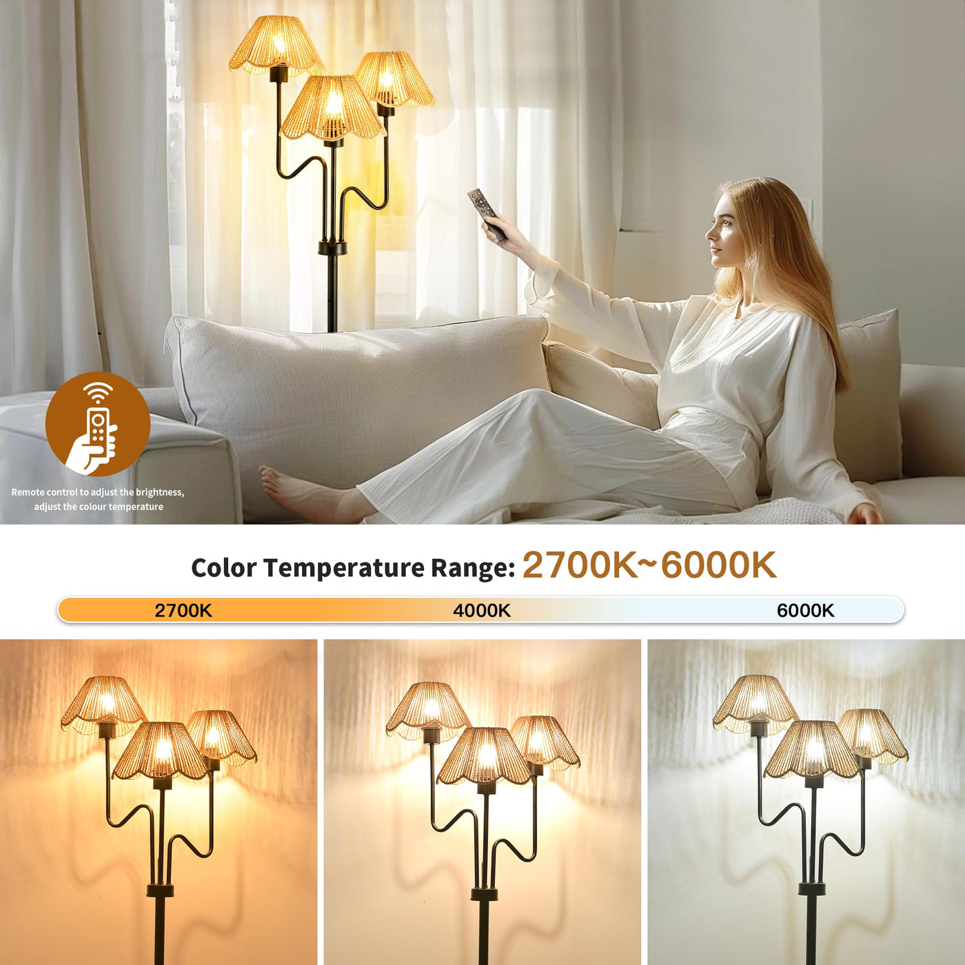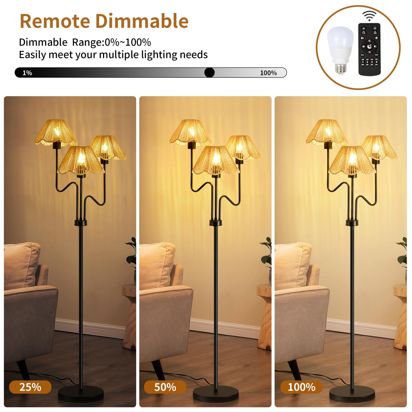 Zecoxol Rattan Floor Lamp For Living Room Bedroom,3-Light Floor Lamp With Remote Control,Boho Flower Lamp Black Tree Standing La