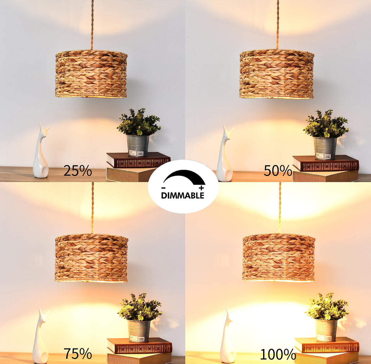 Q: What is the maximum brightness level of the ZECOXOL Rattan Plug in Pendant Light?A: The ZECOXOL Rattan Plug in Pendant Light features a stepless dimmable design, allowing you to adjust the brightness from 1% to 100%, making it suitable for various activities such as studying, playing, or resting.