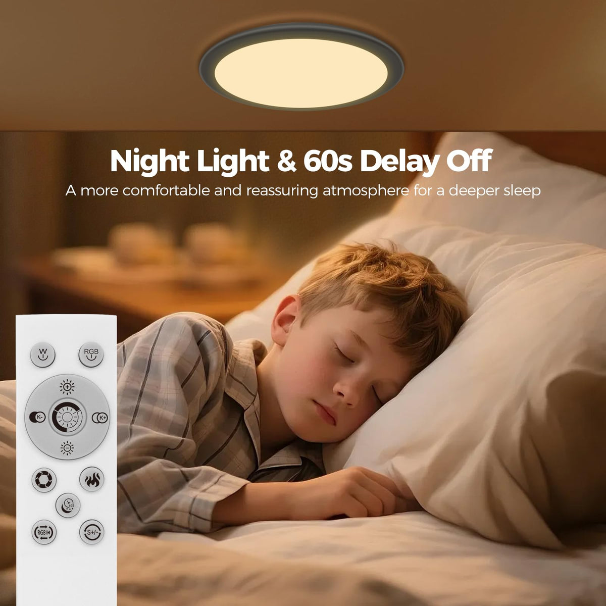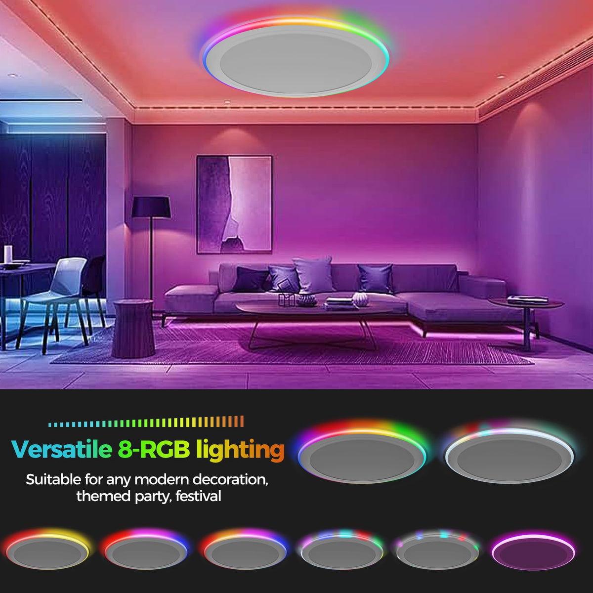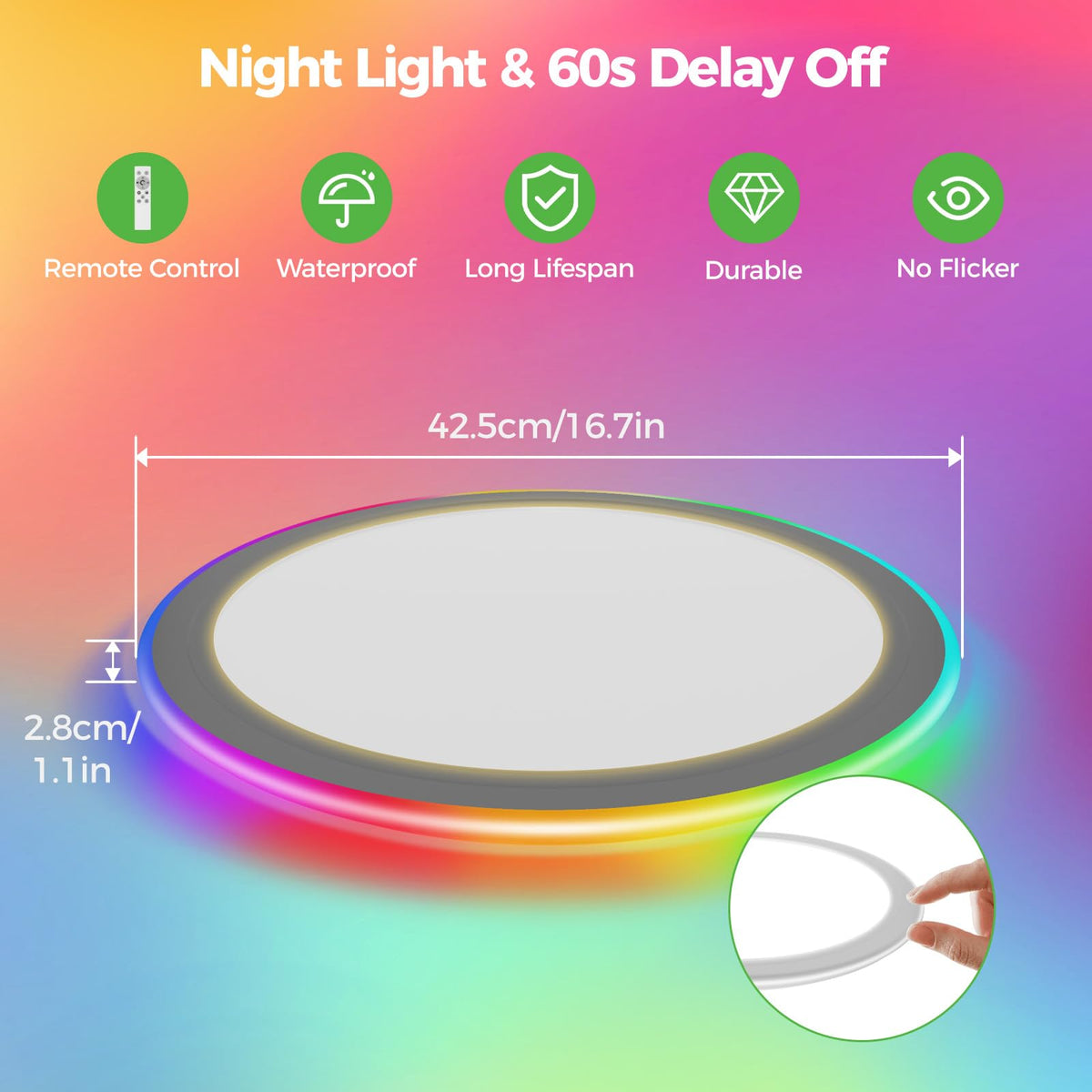 All Functions Of This Ceiling Lamp Can Be Controlled With The Remote Control Supplied. Rgb Color Change Brightness Adjustment Night Light Timer Memory Function Color Temperature Adjustment. With Remote Control You Can Control Several Smart Ceiling Lights In Bedrooms ChildrenS Rooms Bathrooms Kitchens Living Rooms Laundry Stairwell Hallways Nursery Stairs And Garage Within A Radius Of 3 M Making Your Life More Comfortable. The Ultra-Slim And Elegantes Nightlight Will Look Great In Any Type Of Interior Design Modern Contemporary Or Traditional. Furthermore This Rgb Lights Is Made To Last Up To 50 000 Hours Assuring A Durable And Dependable Lighting Option For Many Years To Come. This Light Promises To Provide Brilliant Uniform Lighting Evenly Throughout The Entire Space Whether You Need It To Brighten A Closet Hallway Bedroom Kitchen Or Living Room. Close To Ceiling Light Fixtures Rgb Backlight 8 Colors Optional Via Remote Control. Supports 3000K/5000K/6000K Color Temperature Adjustable And 10%-100% Brightness Dining Meet Your Preferences In Different Scenarios. Night Light Feature: Soft And Quiet Light In Night Light Mode Can Help You Relax And Improve Sleep Quality. 60S Timer + Memory Settings. The Design That Memorizes The Last Setting And Delays The Shut-Off Time Better Meets Your FamilyS Needs. Ip64 Waterproof: Size:16 Inch Diameter/1 Inch Thickness