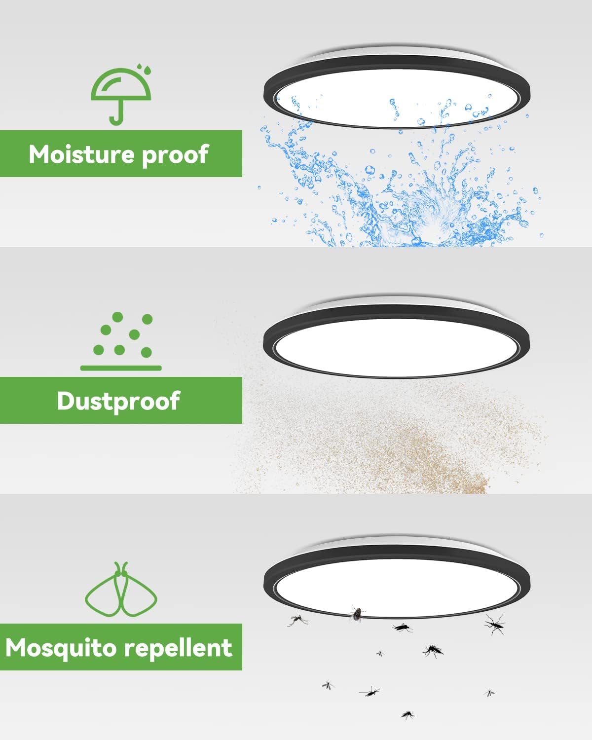 Q: Is the zemty LED ceiling light safe for use in bathrooms?A: Yes, the zemty LED ceiling light is designed with safety in mind. It features an ultra-slim, integrated seal design that makes it IP44 rated, meaning it is both water-resistant and dustproof, making it suitable for bathroom use.