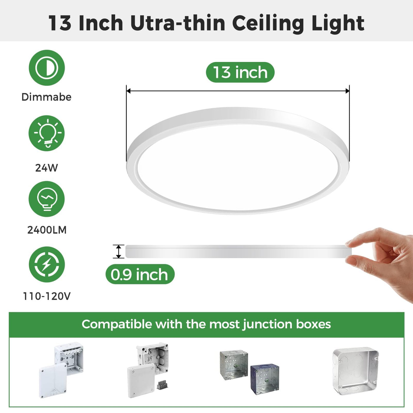Zemty 13-Inch Ceiling Light: Versatile Illumination For Any Spacekey Features:5 Color Options: Choose From 5 Adjustable Color Temperatures (2700K Warm White, 3000K Soft White, 3500K Natural White, 4000K Cool White, 6500K Bright White) To Create The Perfect Ambiance In Any Room.Smooth Dimming (10%-100%): Enhance Your Space With Dimmable Lighting That Saves Energy And Allows For Customizable Brightness Levels For Various Activities.Reliable Performance: Enjoy Flicker-Free, Instant-On Operation. Energystar And Damp-Rated For Dependable Use, And Etl Listed For Safety. Backed By A 5-Year Warranty.Bright &Amp; Efficient: High-Efficiency 28W Leds Deliver Ample Illumination (3200 Lumens), Ideal For Spaces Of 6-24Sq Ft While Reducing Utility Costs.Easy Installation: Enjoy Hassle-Free Setup With Our Simple 3-Step Process And All Necessary Hardware Included. Just Connect Two Wires And Secure With A Quarter Turn. Ideal For Spaces (10-20 Square Feet) Such As Shower Rooms, Entryways, Utility Rooms, Laundry, Dining Rooms, Studies, Closets, Offices, Garage Hospitals, And Apartmentsversatile Application: Perfect For Living Rooms, Bedrooms, Kitchens,Basements, Hallway,Entryway, Wardrobe And More. Waterproof Ip44 Rating Makes It Suitable For Bathrooms And Shower Rooms. Complements Various DÉCor Styles.Specifications:Color: Whitematerial: Pc, Plastic, Absvoltage: 120Vpower: 28Wdiameter: 33Cm / 13 Inchesthickness: 2.3Cm / 0.9 Inchesbrightness: 3200 Lumensworking Temperature: -20&Deg;C To 60&Deg;Cstyle: Modern, Minimalist, Contemporarypackage Includes:Ceiling Lightuser Manualmounting Hardwarenote:Turn Off Power Supply Before Installation.Check Voltage, Wattage, And Size For Proper Fit.Select Preferred Color Temperature Before Mounting.