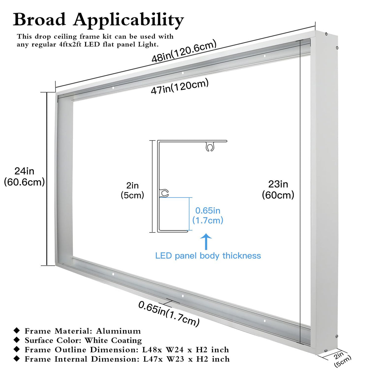 - ?? **Universal Use:** Pack of 4. External size: L=48"(120.6cm), W=24"(60.6cm), H=2"(5cm). Ensure that the flat panel light is less than 2" (5cm) in total height and has a body thickness of less than 0.65"(1.7cm). This surface mounting kit is suitable for most 2x4ft LED flat panel lights and offers an innovative and improved flush mounting method that saves both money and effort.