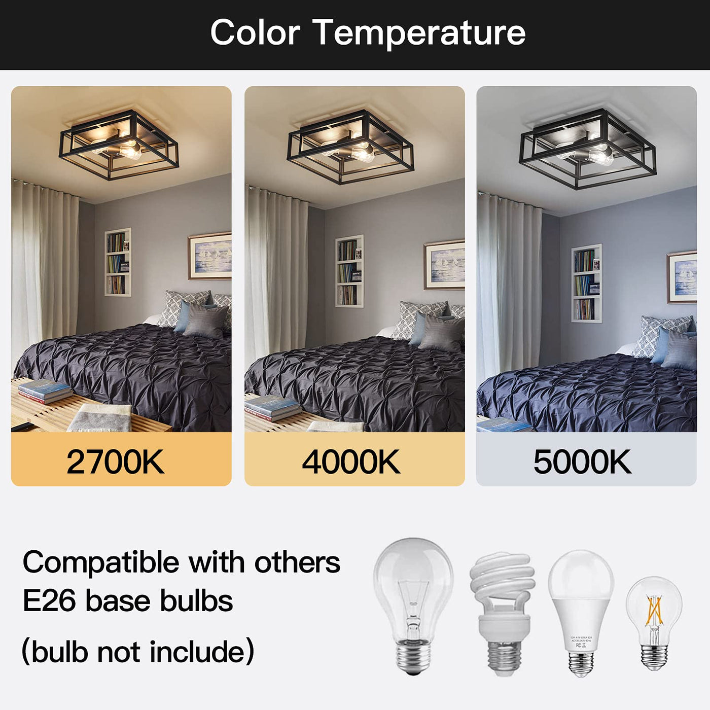Q: What type of bulbs can I use with the ZGLAOJT Black Flush Mount Ceiling Light Fixture?A: The ZGLAOJT Black Flush Mount Ceiling Light Fixture is compatible with E26 base bulbs and is recommended to use a maximum of 60W per bulb. For dimming capabilities, consider using dimmable bulbs and dimmers.