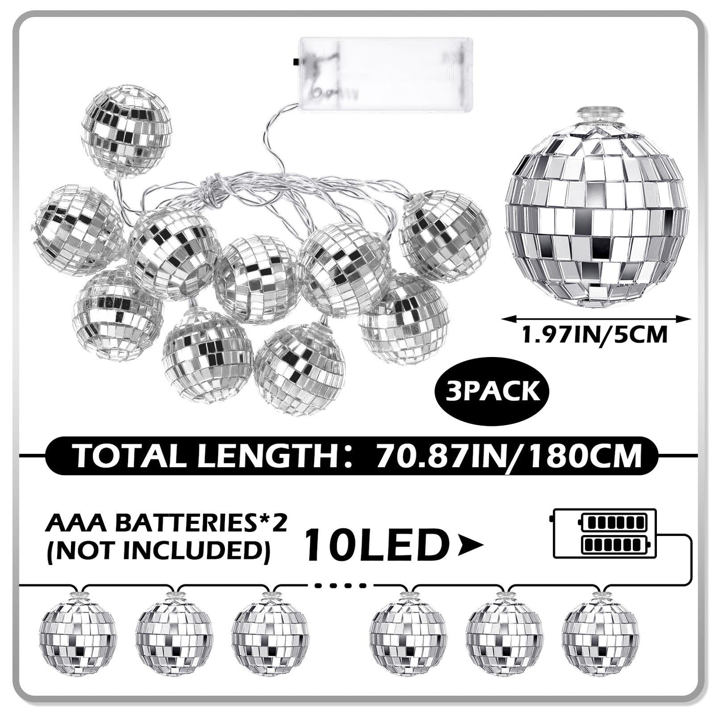 Package includes 3 strands of disco ball string lights, each with 10 LED lights.