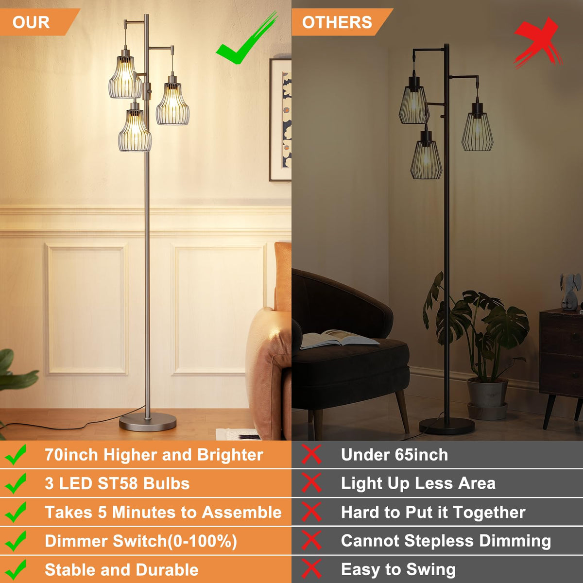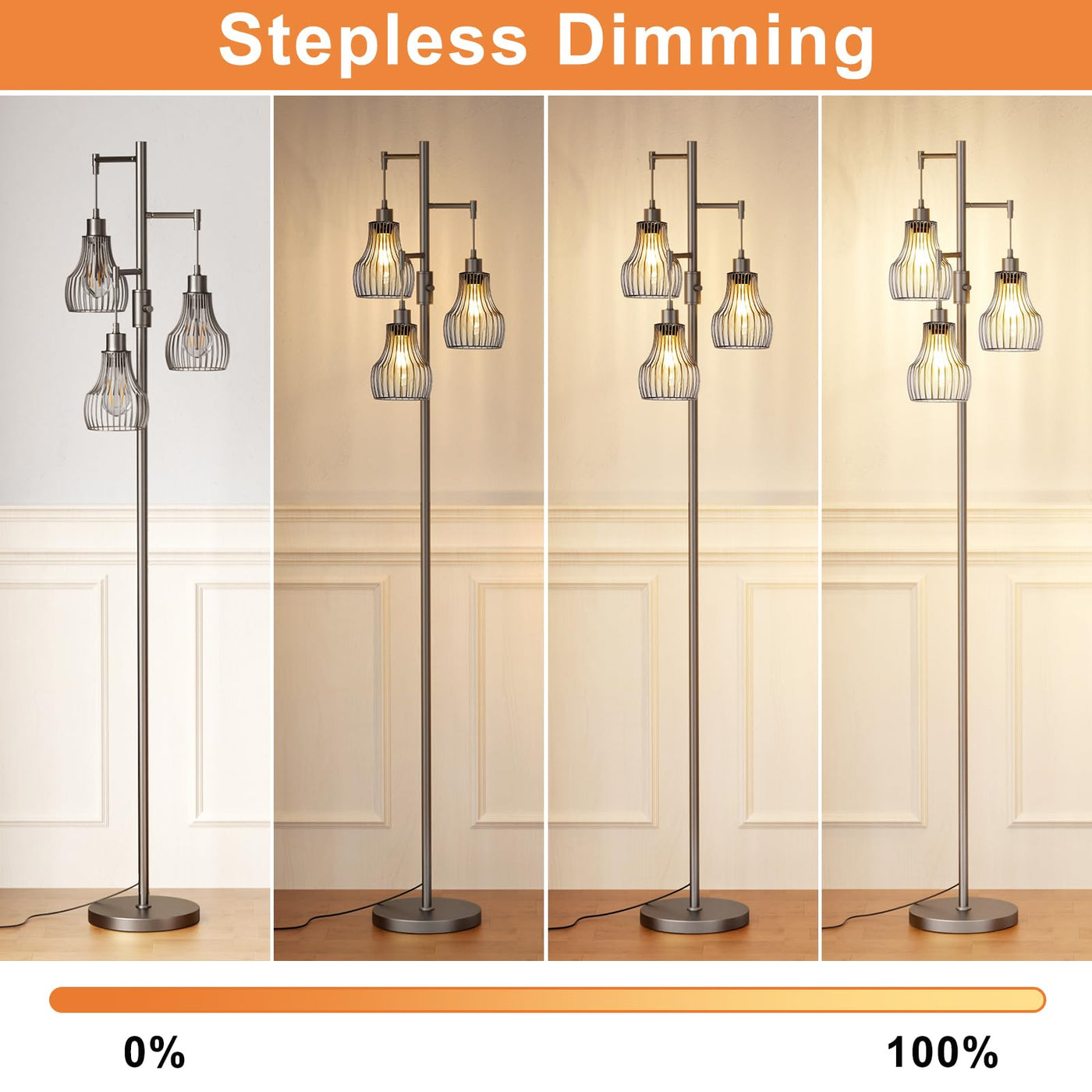 ?2024 UPGRADED FLOOR LAMPS?- The tall 3-cage grey floor lamp blends farmhouse and vintage styles to perfectly match any decor in your home.In March, we upgraded our materials to include professionally certified all-metal bodies. Our fixtures are more stable and durable, eliminating problems such as sudden shut-offs and unstable installations. Enjoy superior quality and make life easier and more comfortable. | ?Adjustable, Stepless Dimming(0-100%)?- Unlike other traditional non-dimming floor lamps, our dimmable floor lamp is completely stepless dimming. Grey floor lamp has a knob to adjust the brightness of the light rather than just turning on the lamp, having it be super bright lighting.The dimming feature is better than expected as tall floor lamp has certain settings so you can make it as dim or as bright if you want. And you will love the pattern the cage makes on the wall. | ?Farmhouse Floor Lamp Design?- Our floor lamps are designed in a sleek and modern style, which can be matched with different styles of furniture you want. The tall lamps will transform your home decor into a rustic and farmhouse atmosphere. Perfect for your living room, bedroom, corner or office, standing lamp has an elegant, vintage look. Brightly illuminated floor lamps for the living room blend in and add an unassuming accent to the space. | ?Durable & Stable?- In order to ensure the safety and stability of this standing lamps for living room, we have equipped a sturdy base weighing about 5.3lb to prevent the living room lamp from tilting and shaking. In addition, industrial floor lamp is made of high quality metal and iron. And the 0.8mm thick pipe surface is evenly painted to prevent corrosion and provide a matte touch. | ?Easy to Assemble? - The assembly steps are simple and easy to operate, and it can be installed into a bedroom floor lamp in just a few minutes. Attention: When installing three small light poles to the main light pole, you need to use Allen Key (included) to tighten and fix them. All components of floor lamps have passed professional certification. If you receive any defective products, please contact us immediately via email and we will provide you with a solution within 24 hours.