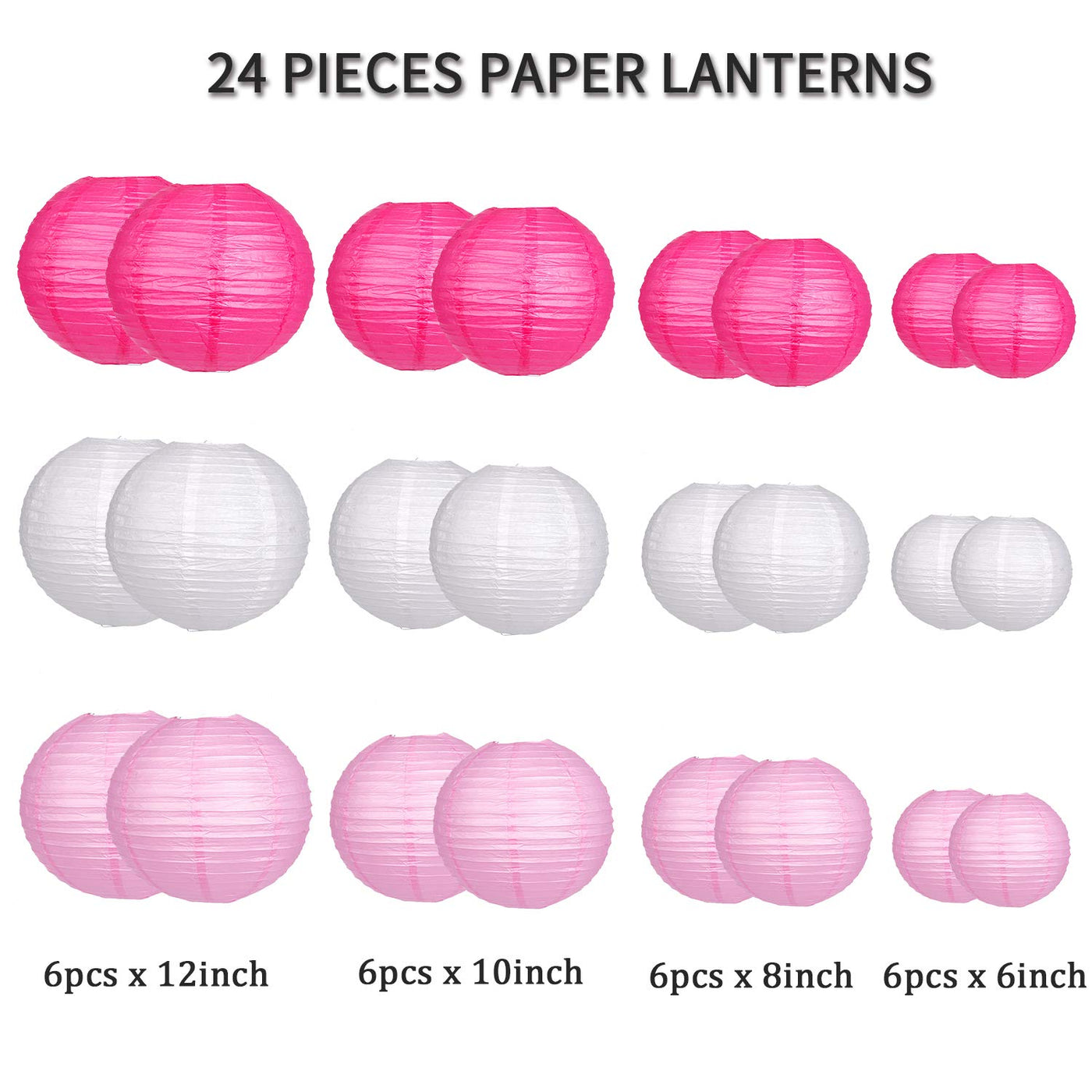 - **Versatile Decor**: Each set includes 24 exquisite paper lanterns in three stunning colors: pink, hot pink, and white, available in four different sizes (12", 10", 8", and 6"). These delightful lanterns are perfect for adding charm to children's DIY projects, weddings, baby showers, and festive gatherings.