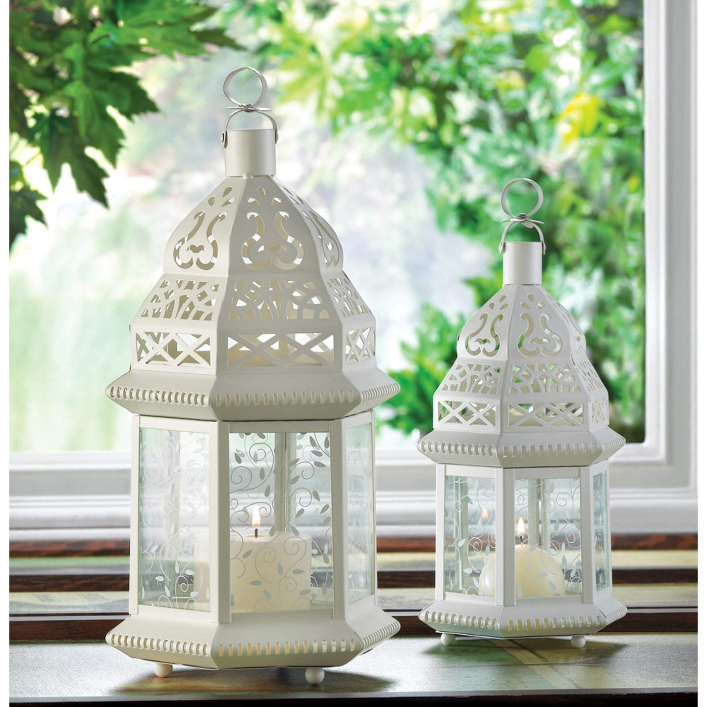 Q: What is the size of the Zingz & Thingz Large White Moroccan Candle Lantern?A: The Zingz & Thingz Large White Moroccan Candle Lantern measures 15.28 inches in length and 8.98 inches in width, making it a substantial piece for any decor.