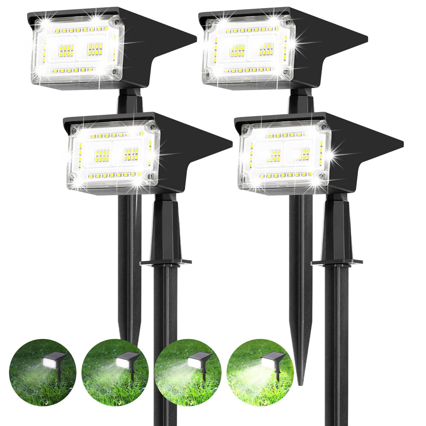 Q: What are the different lighting modes available with ZJOJO solar spot lights?A: The ZJOJO solar spot lights feature four distinct lighting modes. These modes allow you to adjust the brightness and duration of light to suit your outdoor needs, providing flexibility for various settings.
