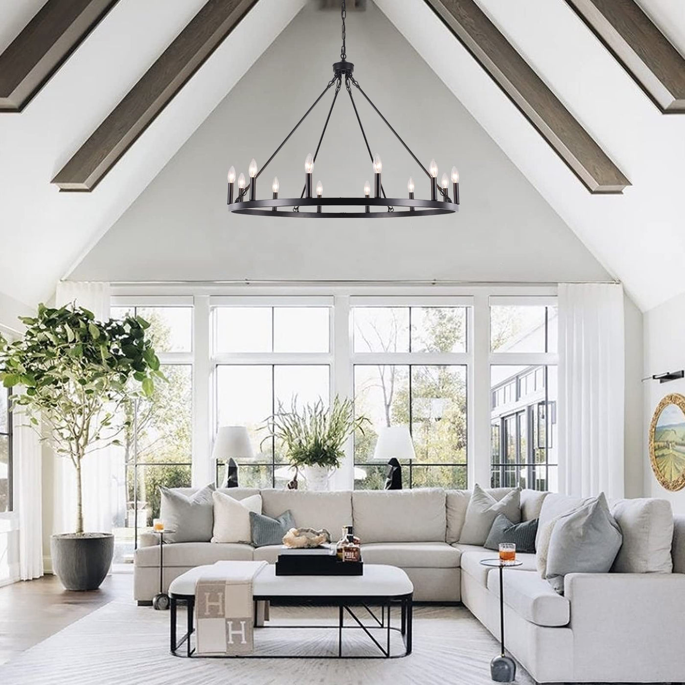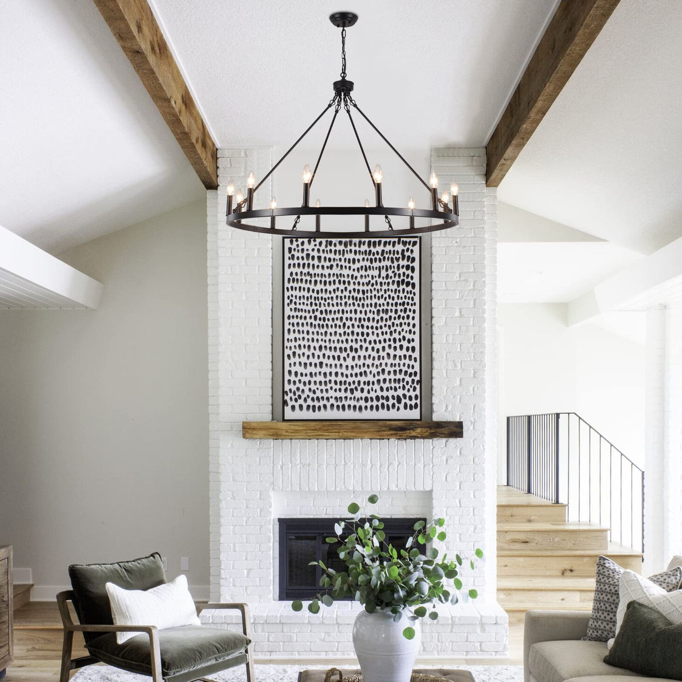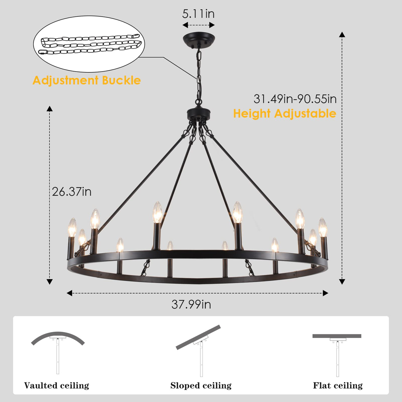 ?Large Farmhouse Chandelier?This 12-Light Wagon Wheel Chandelier Is An Amazing Lamp, Design Features Linked Rods That Support The Vertically Oriented Exposed Bulb, Making The Modern And Farmhouse Style Minimalism Perfectly Combined, It Looks Great Anywhere In The House | ?Compatible E12 Lamp Holder? Farmhouse Dining Room Chandelier Is Hard-Wired, Required 12 X E12 Bulb,110-130V Voltage (Bulb Not Included) Compatible With Led, Edison, Incandescent, Compact Fluorescent, And Halogen Bulbs. | ?Size & Height Adjustable?Wagon Wheel Chandelier Diameter 38'', Canopy Width: 5.11''. Black Chandelier Lighting Fixture Comes With 64'' Adjustable Black Metal Hanging Chain, The Maximum Overall Length Is 90.55'' And The Minimum Overall Length Is 31.49'', It Can Be Adjustable According To Your Preference And Design. | ?Assembly Required?This Oversized Round Chandelier Comes With All Mounting Hardware And Detailed Installation Instructions Included, All The Bulb Sockets, Electric Wires Are Ul Listed, Safe And Reliable. | ?Wide Application? The Black Round Chandelier Is Great For The Living Room, Bedroom, Foyer, Hallway, Kitchen, And Island. Come With An Adjustable Length Chain Makes It Available For Flat, Sloped, Slanted, Or Vaulted Ceilings,