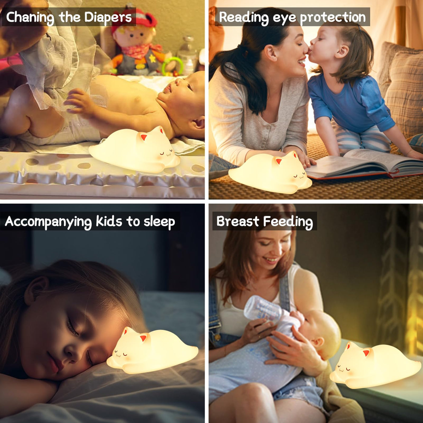 Safe Materials ? The cat night light is made of non-toxic baby safety silicone and does not contain bisphenol A. The soft silicone can be freely kneaded and quickly rebounded. The silicone shell is thickened to prevent easy breakage or damage. | ?Tap Control+7 Colors cat light? Just click on the cute cat light and you can turn it on/off and enter the 7 color changing mode. The cat childs night light baby emits a soft night light for the childrens room. When tapping and changing color, the kawaii cat light brings the pleasure of tapping. Cute night lights not only provide lighting, but can also be used as room decorations at night. Warm white light, soft light, warm and comfortable visual experience, long-term use will not harm the eyes. It is an ideal emotional light for bedrooms, bedside, hotels, study rooms, and more. | ? USB Charging Portable Design ? If youre looking for a night light for kids, the cute table lamp cat lamp is ideal!The packaging includes a USB cable, which can also be plug and play. Portable size, lightweight, and cute cartoon design suitable for your child, your child can take it anywhere or use it as a toy! The Baby Night Light Kids Bedside Lamp is cordless so babies can cuddle and soothe with the cute cat light. | ? Childs Best Friend ? Lets turn on the cat night light to illuminate your room and help your child overcome their fear of darkness. The soft and warm light is both comfortable and makes it easier for them to fall asleep. If they wake up in the middle of the night, they no longer need to touch the darkness.If youre looking for a night light for kids, the cute table lamp cat light is ideal! Keep kawaii cat & cat stuff as your childs sleeping companion! | ? Meet various needs ? Cute animal night lights in childrens rooms, small lights for breastfeeding or changing diapers at night in baby rooms, decorative lights in daycare centers, camping atmosphere lights, and various places that need to touch small night lights. Undoubtedly, this is an excellent gift for family, friends, and children on birthdays and holidays!Not only as a kawaii baby night light kids, cute cat lamp can also be used for cute gifts/cat stuff/gifts for cat lovers/cat lover gifts!