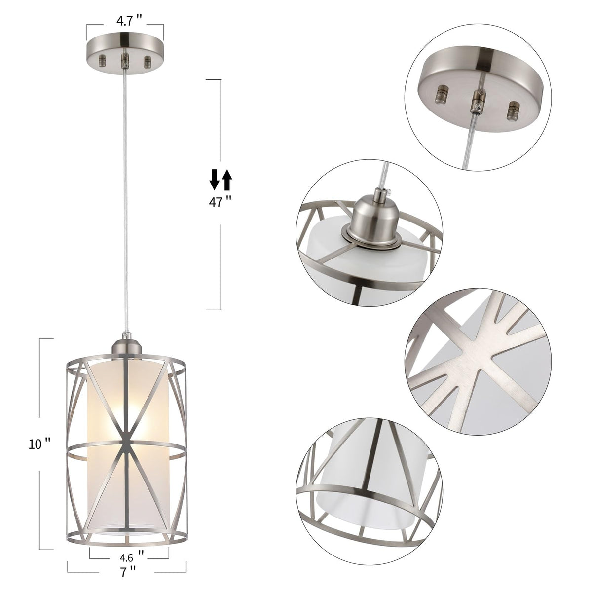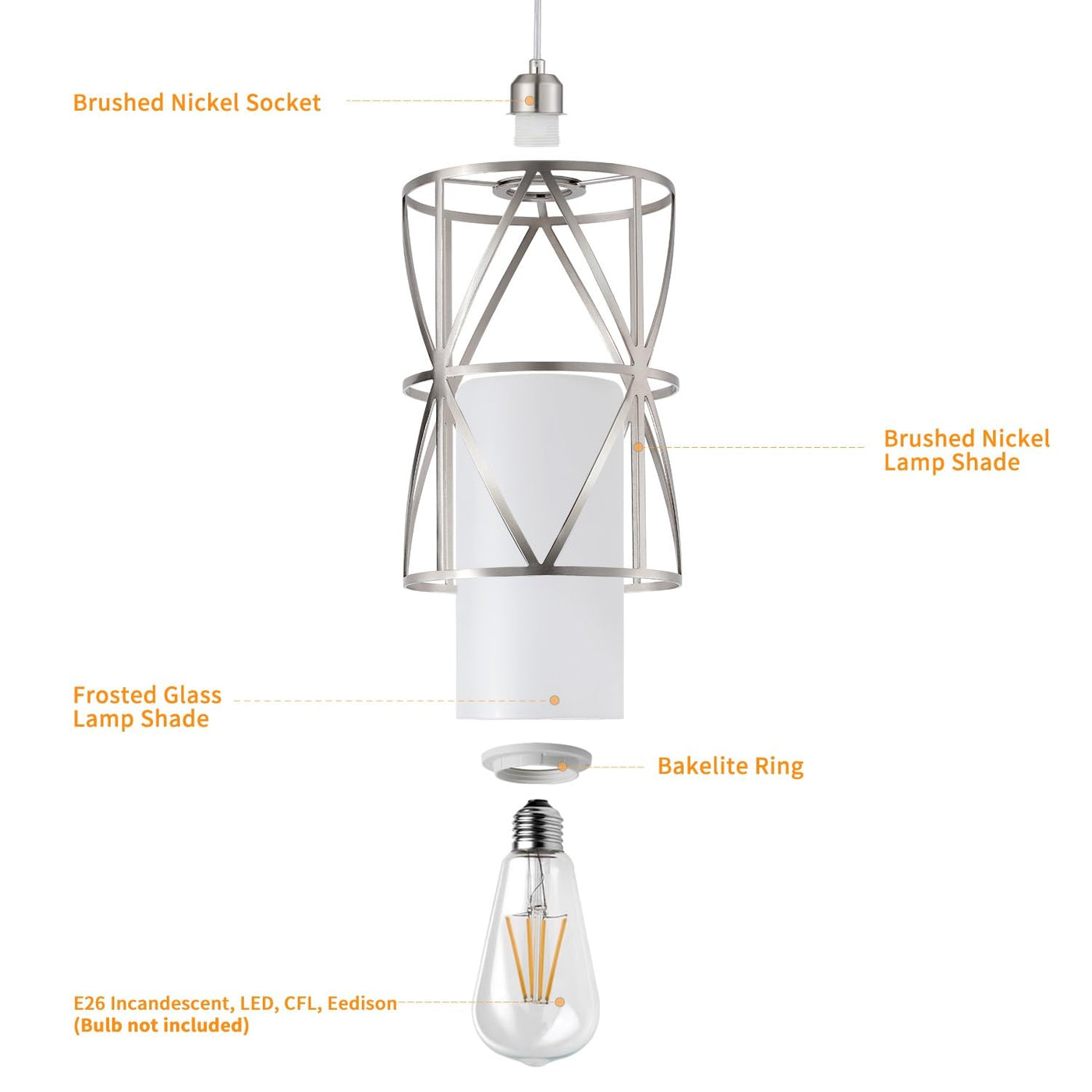 About Brushed Nickel Hanging Pendant Light: 1. Frosted Glass Shade The handmade nature of the frosted glass lampshade makes the product more refined and elegant. Give off enough light for a room while cast a romantic and gorgeous ambience