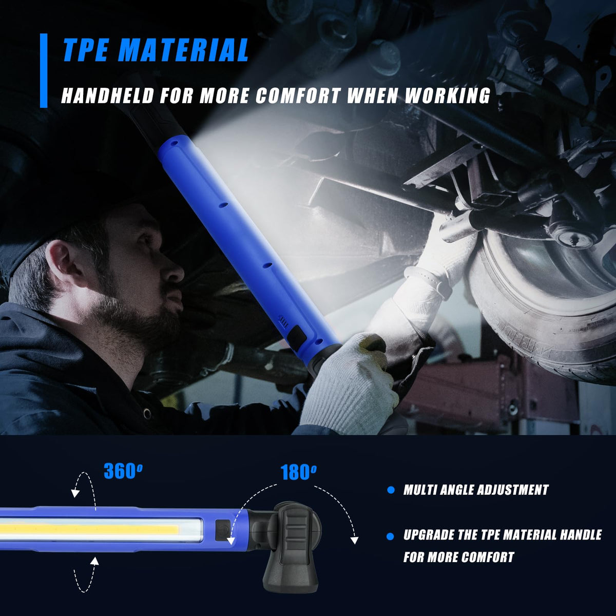 Q: How long does the battery last on a single charge?A: With a built-in 5200mAh rechargeable battery, the work light can last up to 3 hours in high-brightness mode and 7 hours in low-light mode.
