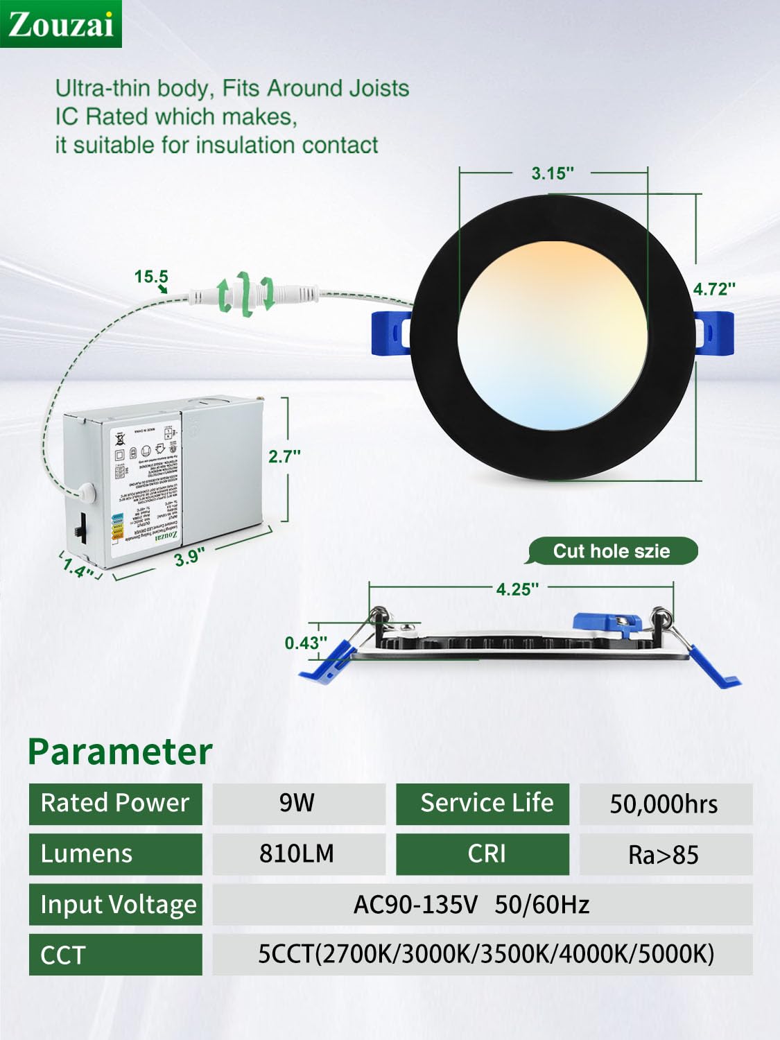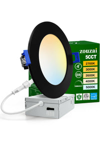 Zouzai 1 Pack 4 Inch Black 5Cct Ultra-Thin Led Recessed Ceiling Light With Junction Box, 2700K/3000K/3500K/4000K/5000K Selectabl