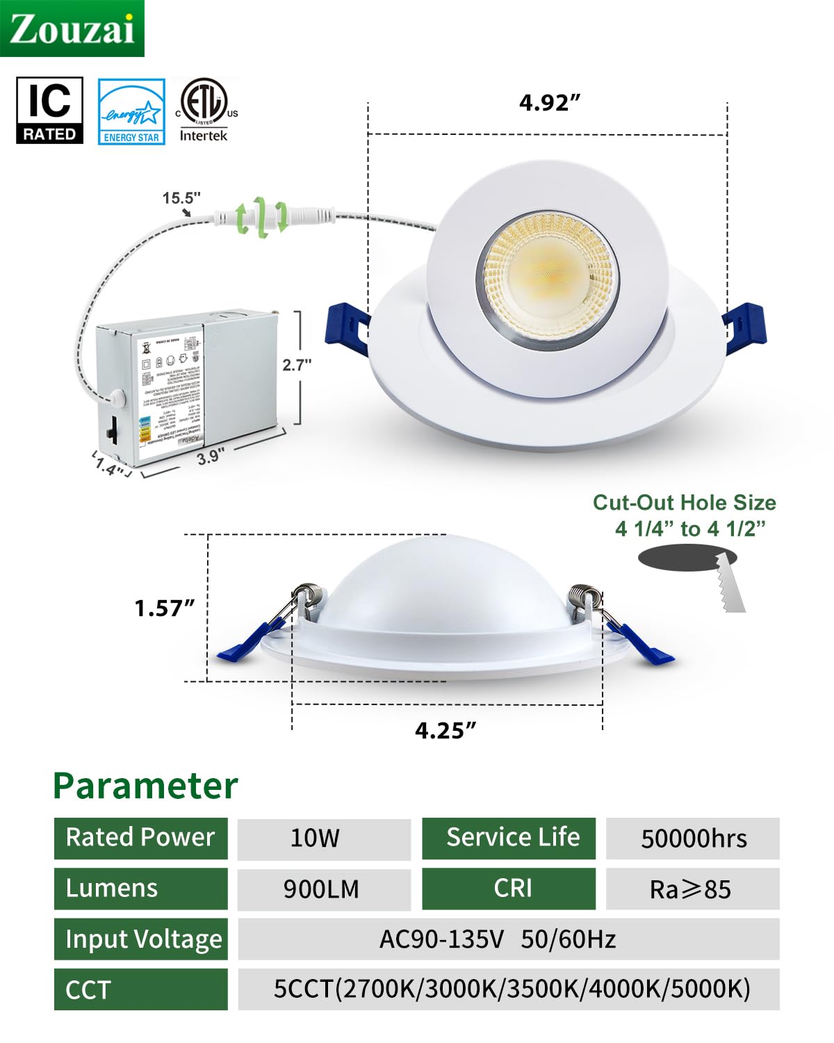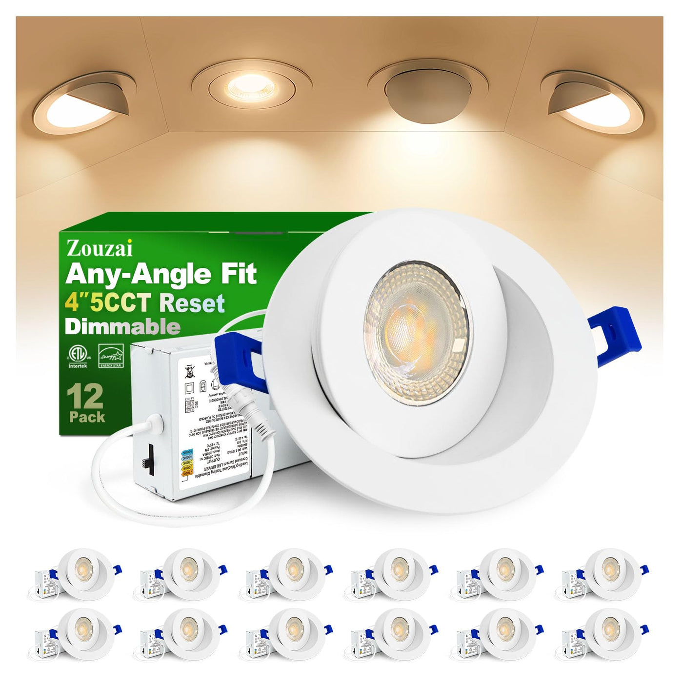 Zouzai 12 Pack 4 Inch 5Cct Led Gimbal Led Recessed Light With Junction Box, 90 Adjustable Directional Eyeball Lighting, Dimmable, 2700K/3000K/3500K/4000K/5000K, 900Lm, 10W=85W-Etl&Energy Star