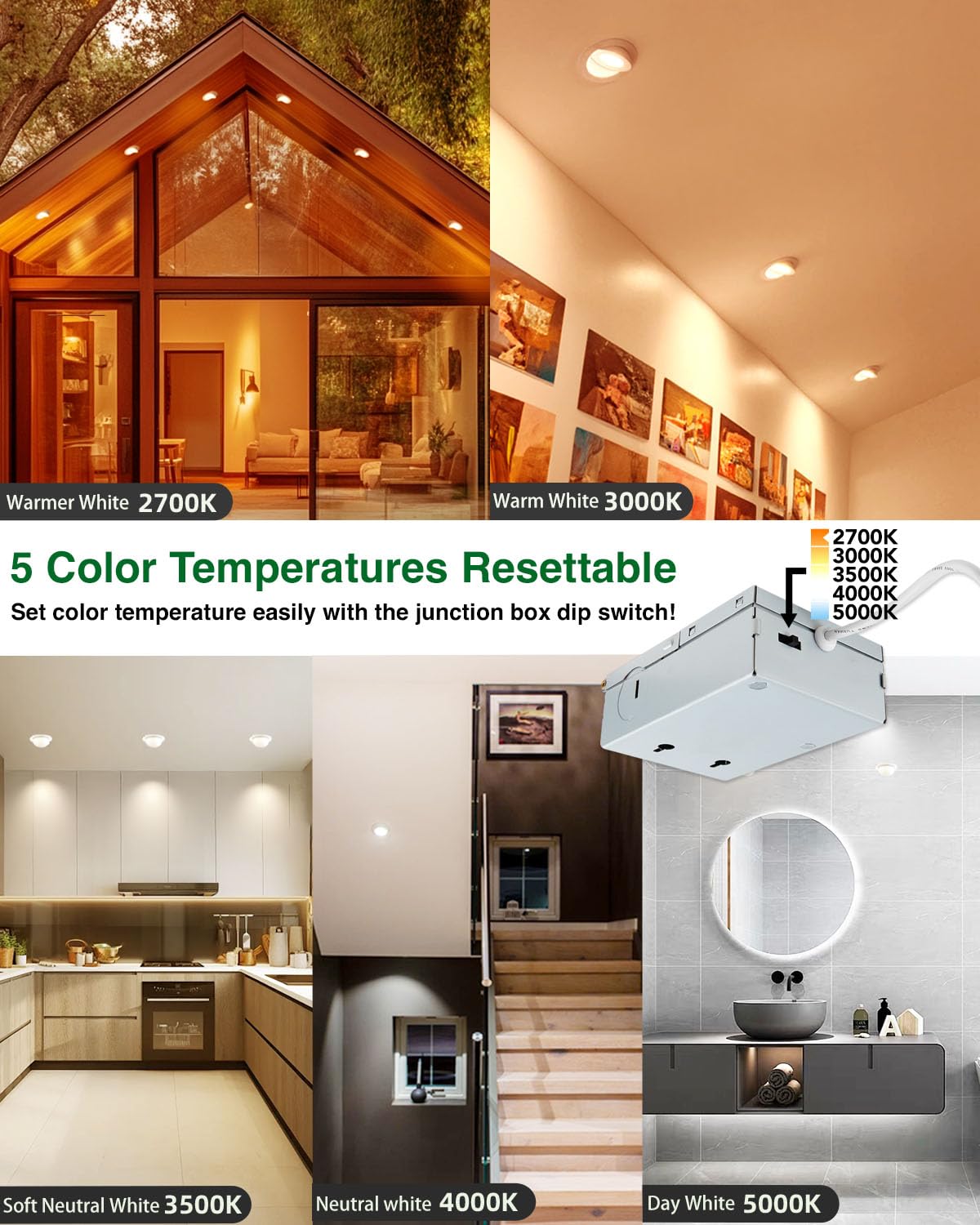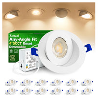Q: What are the benefits of using the zouzai 12 Pack 4 inch 5CCT LED Gimbal Recessed Lights?A: The zouzai LED gimbal recessed lights offer 360° horizontal rotation and 90° vertical tilt, allowing you to direct light exactly where you need it. With a 5-in-1 color temperature selector, you can easily adjust the ambiance from warm to cool lighting, making it perfect for various settings like kitchens, living rooms, or workspaces.