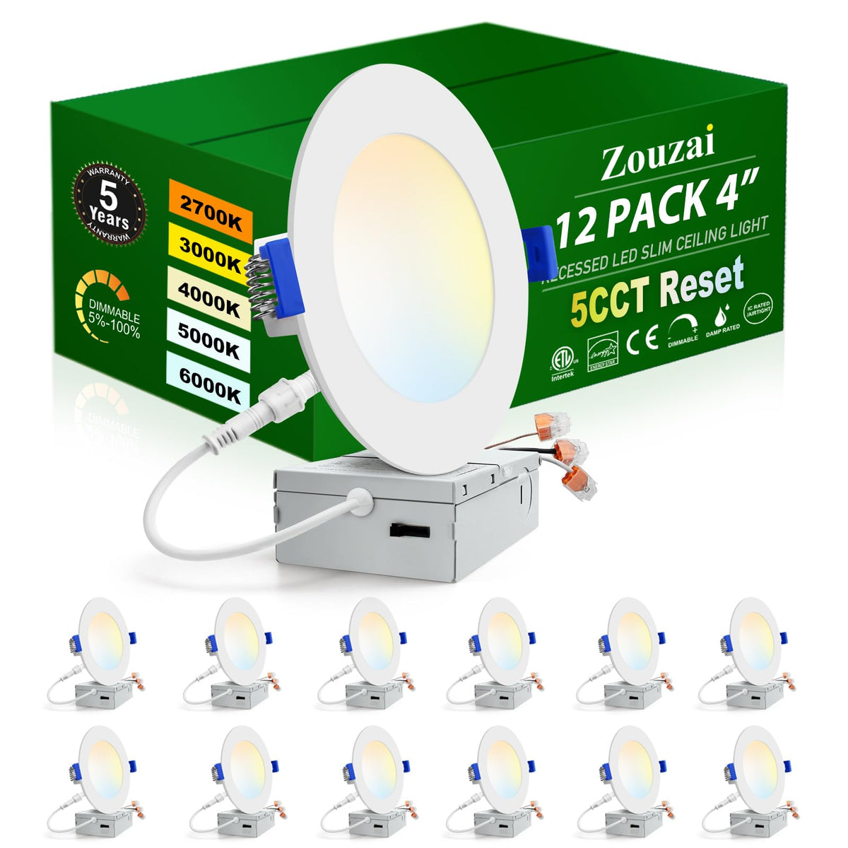 Zouzai 12 Pack 4 Inch 5Cct Reset 6000K/5000K/4000K/3000K/2700K Ultra-Thin Led Recessed Ceiling Light With Junction Box, 9W Eqv 8