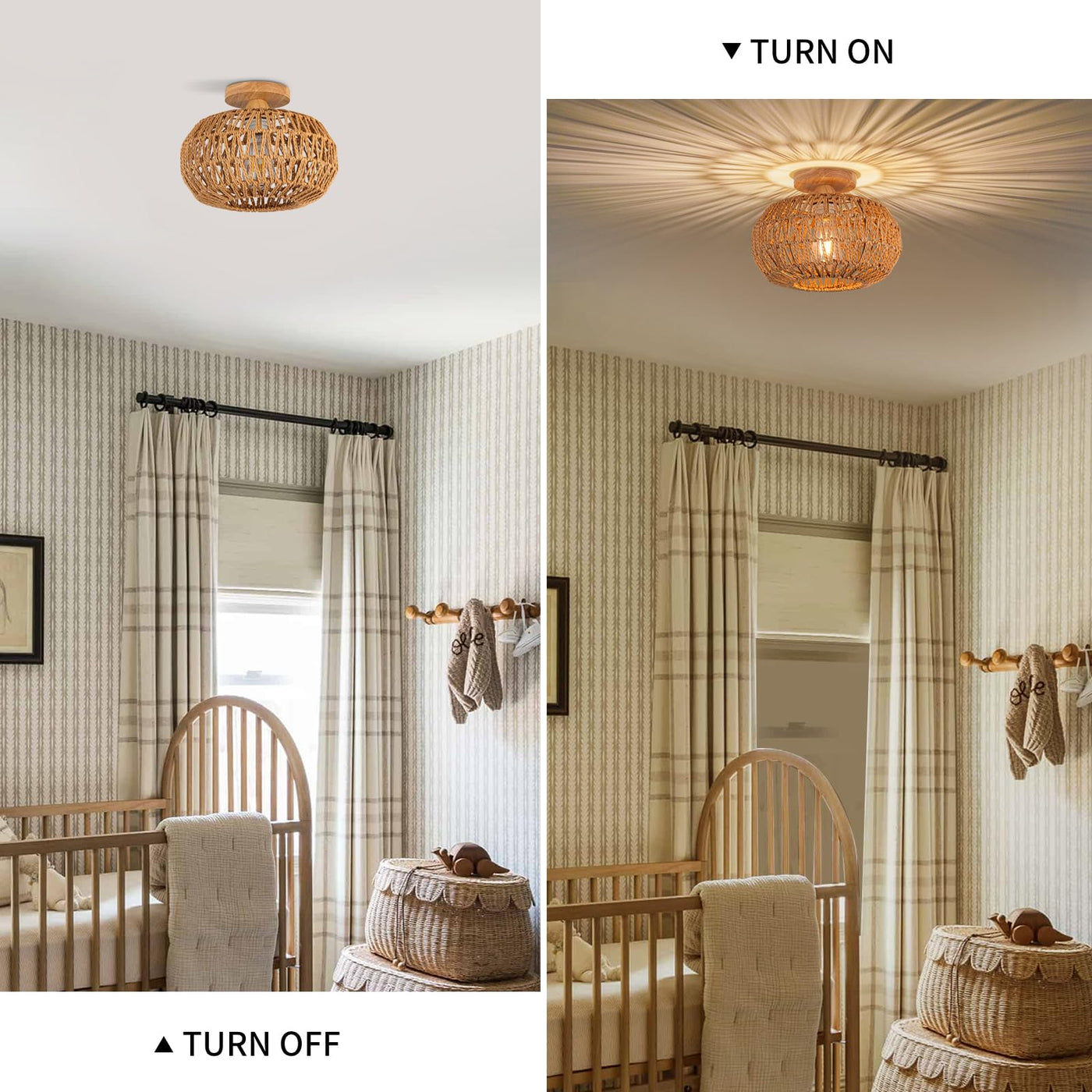 Boho Light Fixtures Mini Chandelier Specifications: Bulb Base: E26/27 Number of Light Bulb Required: 1 Bulb Included: NO Wattage: Max 60 W Voltage: AC 85-265V Material: 100% Hand-Woven Natural Rattan and Round Wooden Base Applications: Closet, Hallway, Corridor, Bedroom, Kitchen, Powder Room, Kitchen Island, Farmhouse Tips: Please use it in dry environment. Please cut off the electricity supply when you install it.