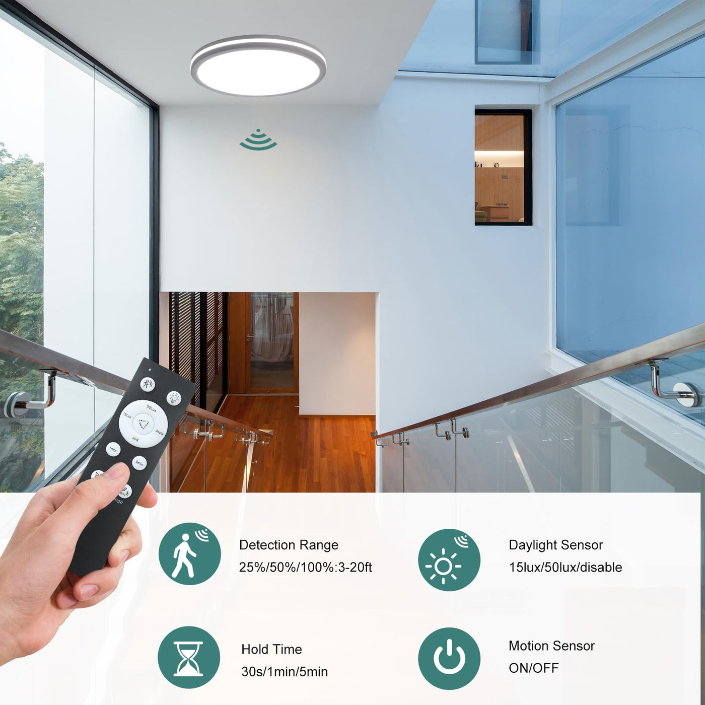 This Motion Sensor Ceiling Light Is Equipped With A Remote Control, Which Can Set The Motion Sensing Mode Or The Continuous On Mode. The Three-Color Temperature Can Be Adjusted (3000K/4000K/6000K). When The Motion Sensing Mode Is Turned On, You Can Control The Sensor Time Lag (30S/60S/360S), Detection Range (25%/50%/100%), And Light Sensitivity (15Lux/50Lux/No Light Sensor) According To Your Own Needs And Preferences. The 11-Inch Induction Ceiling Light Is Ultra-Thin 1.7 Inches, Suitable For Closets, Stairs, Pantry, Sheds, Hallway, Porch, Garage, Hallway And Etc. The Hardwire Sensor Light Has 120V Input, Easy Installation, And Low-Energy Led Technology Provides Bright, Strobe-Free Lighting. 24W Is Equal To 240W Incandescent Lamp.
