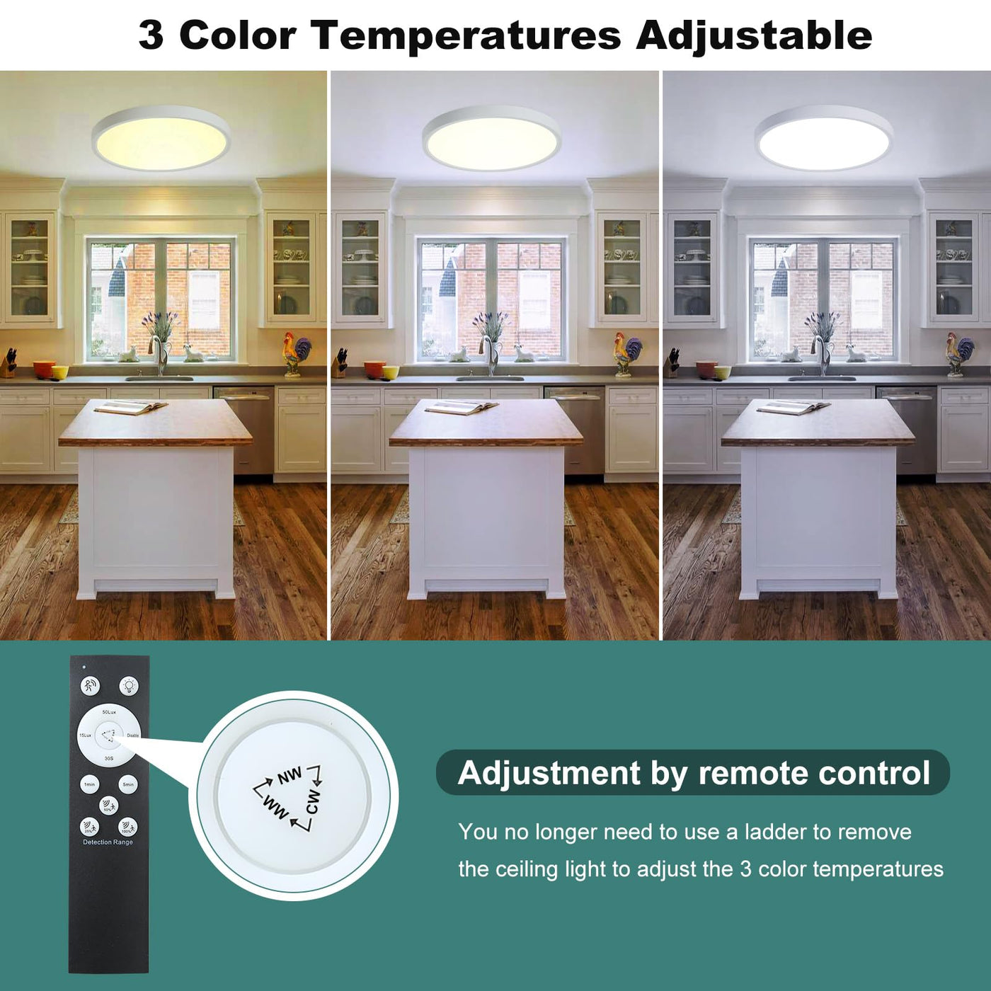 This Ceiling Light With Motion Detection Function, People Come To Light, People Go Light Off, And Twilight Sensing, In The Strong Light When People Pass By The Light Will Not Light, In The Night Or Low Light Automatically Turn On The Light.12 Inch Round Intelligent Sensor Light Has Three Color Temperatures,3000K/4000K/5000K, Ip40 Waterproof Design, Suitable For Installation In Indoor Balconies, Closets, Porches, Stairs, Cars Shed, Closets, Laundry, Etc. With A High-Light Led Chip,24W Is Equivalent To An Incandescent 240W, Which Can Save 85% Of Electricity Bills