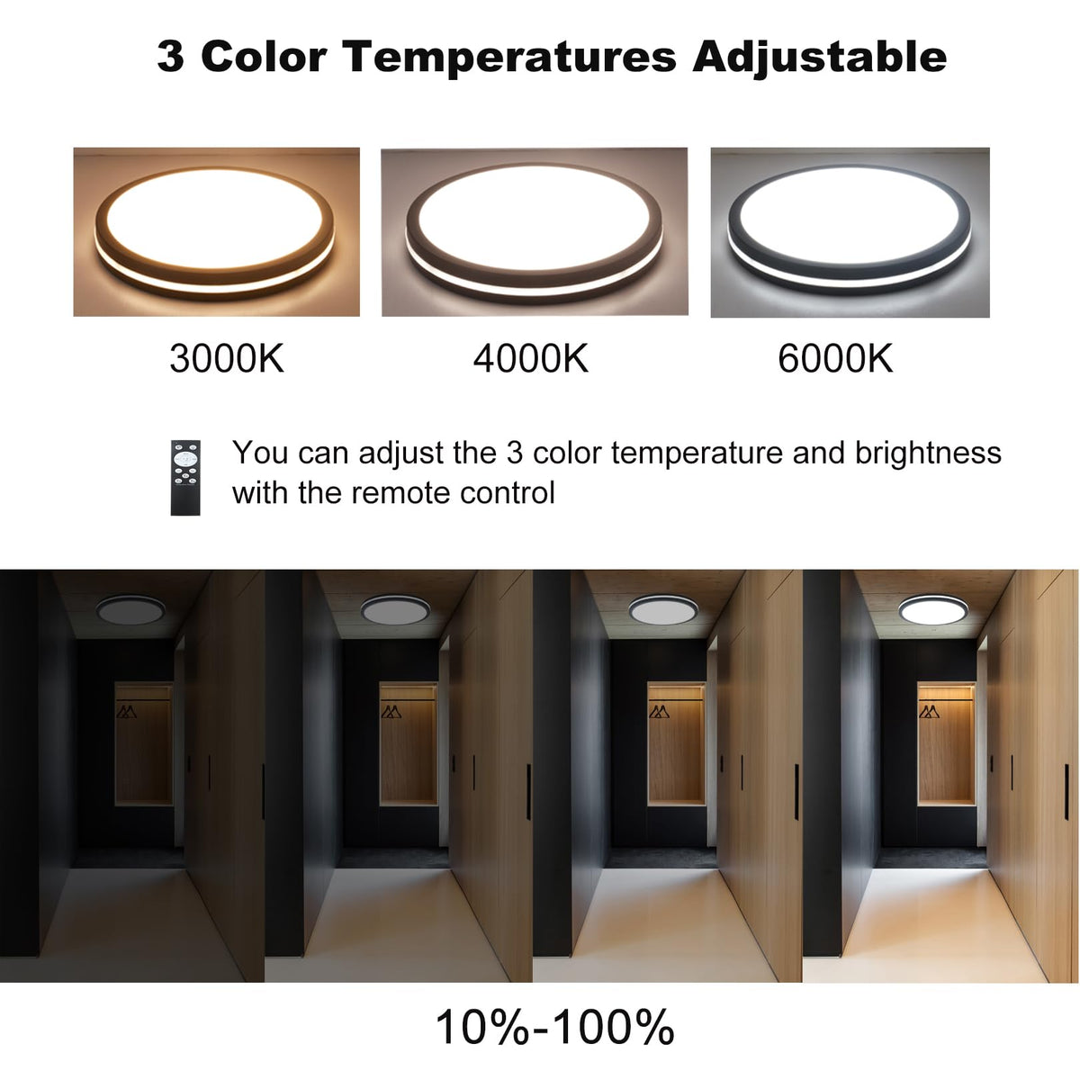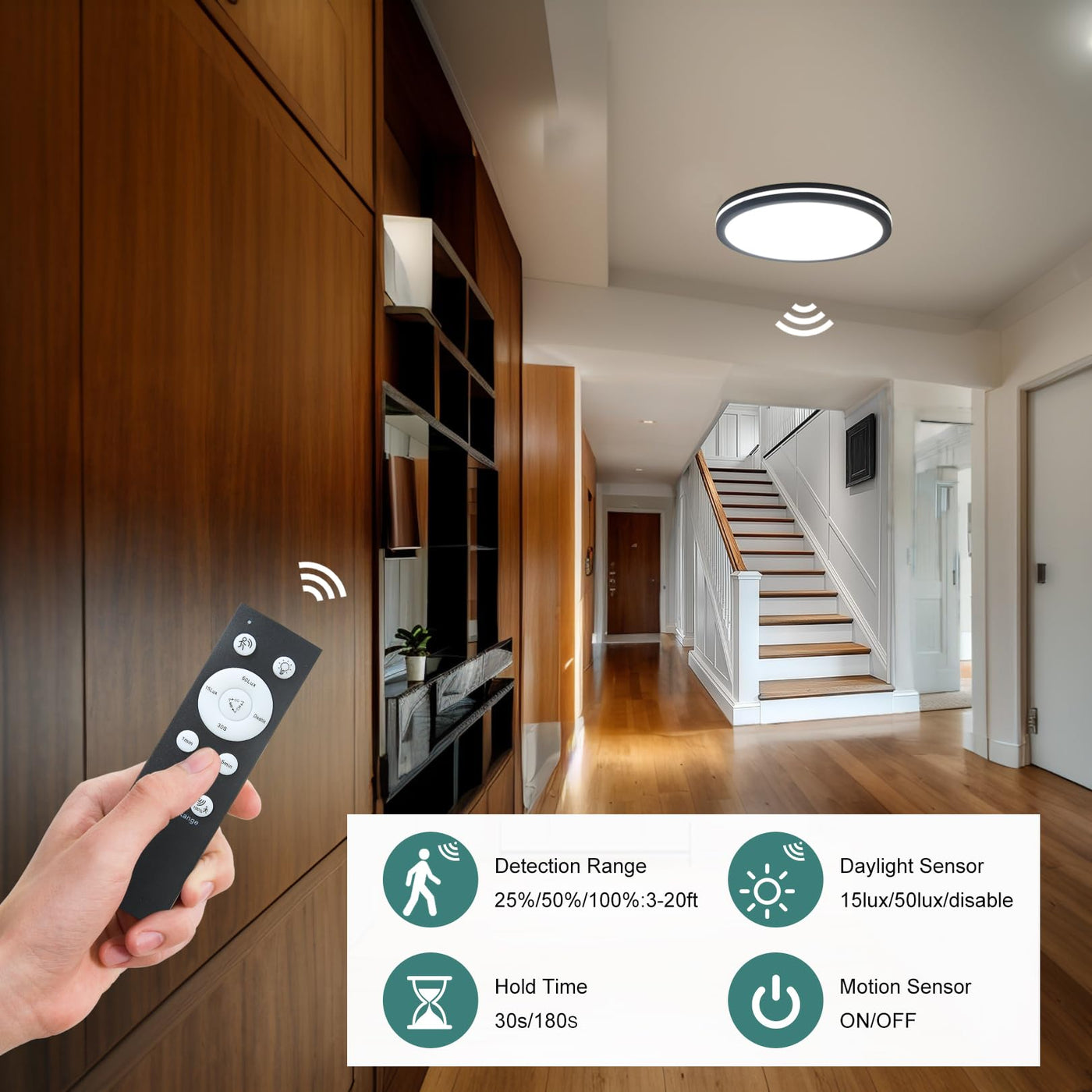 This Motion Sensor Ceiling Light Indoor Or Outdoor Is Equipped With A Remote Control, Which Can Set The Motion Sensing Mode Or The Continuous On Mode. The Three-Color Temperature Can Be Adjusted (3000K/4000K/6000K). When The Motion Sensing Mode Is Turned On, You Can Control The Sensor Time Lag (30S/180S), Detection Range (25%/50%/100%), And Light Sensitivity (15Lux/50Lux/No Light Sensor) According To Your Own Needs And Preferences. The 11-Inch Induction Ceiling Light Is Ultra-Thin 1.7 Inches, Suitable For Closets, Stairs, Pantry, Sheds, Hallway, Porch, Garage, Hallway And Etc. The Hardwire Sensor Light Has 120V Input, Easy Installation, And Low-Energy Led Technology Provides Bright, Strobe-Free Lighting. 24W Is Equal To 240W Incandescent Lamp.