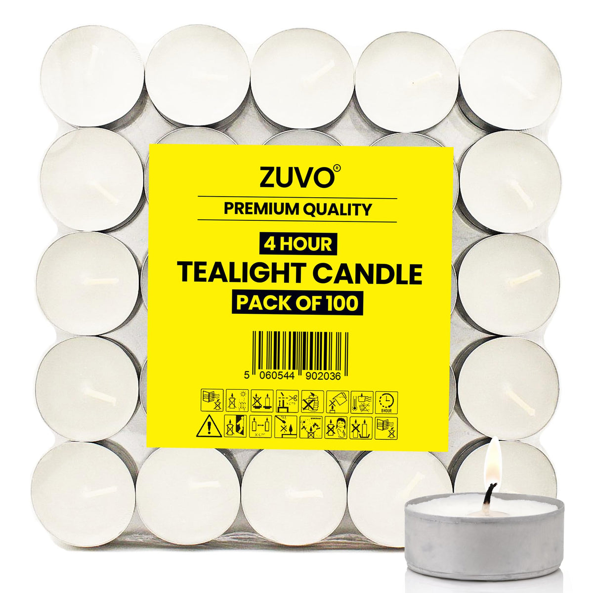 ???????? ???????? ????????: Our 4 hour tealights 100 pack candles provide a long-lasting lighting environment. The Zuvo tea light candles are small in shape and have a bright flame. These 4 hour tea lights are perfect for all events | ???????? ???????? ?????? ???????????? ??????????: Our 4 hour tea lights candles are made with high-quality lead-free cotton wicks. This allows the tea light to burn for 4 hours straight without any problem. These 100 pack t lights set is very efficient for burning without producing smoke | ???????????????? ????????: Each candle of this tea light 4 hour candle set measures in at approx 38x23 mm. This lets you easily use the 100 pack t lights set to decorate your house and restaurant to give it an inviting atmosphere | ???????? ?????? ???????????????? ????????????: Our tea light candles have a 4hr tealights unscented candes burning period is perfect for weddings, parties, and restaurants to provide an ambient environment with our Zuvo tea light candles 100 pack set | ???????????????? ??????????: Zuvo unscented tealights can easily be used for multiple purposes. These 4 hour tealights 100 pack candles are perfect for weddings, birthdays, parties, restaurants, massage parlours and more