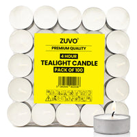 Q: How long do Zuvo tea light candles burn?A: Zuvo tea light candles provide a long burn time of approximately 4 hours, making them ideal for extended use during events and gatherings.