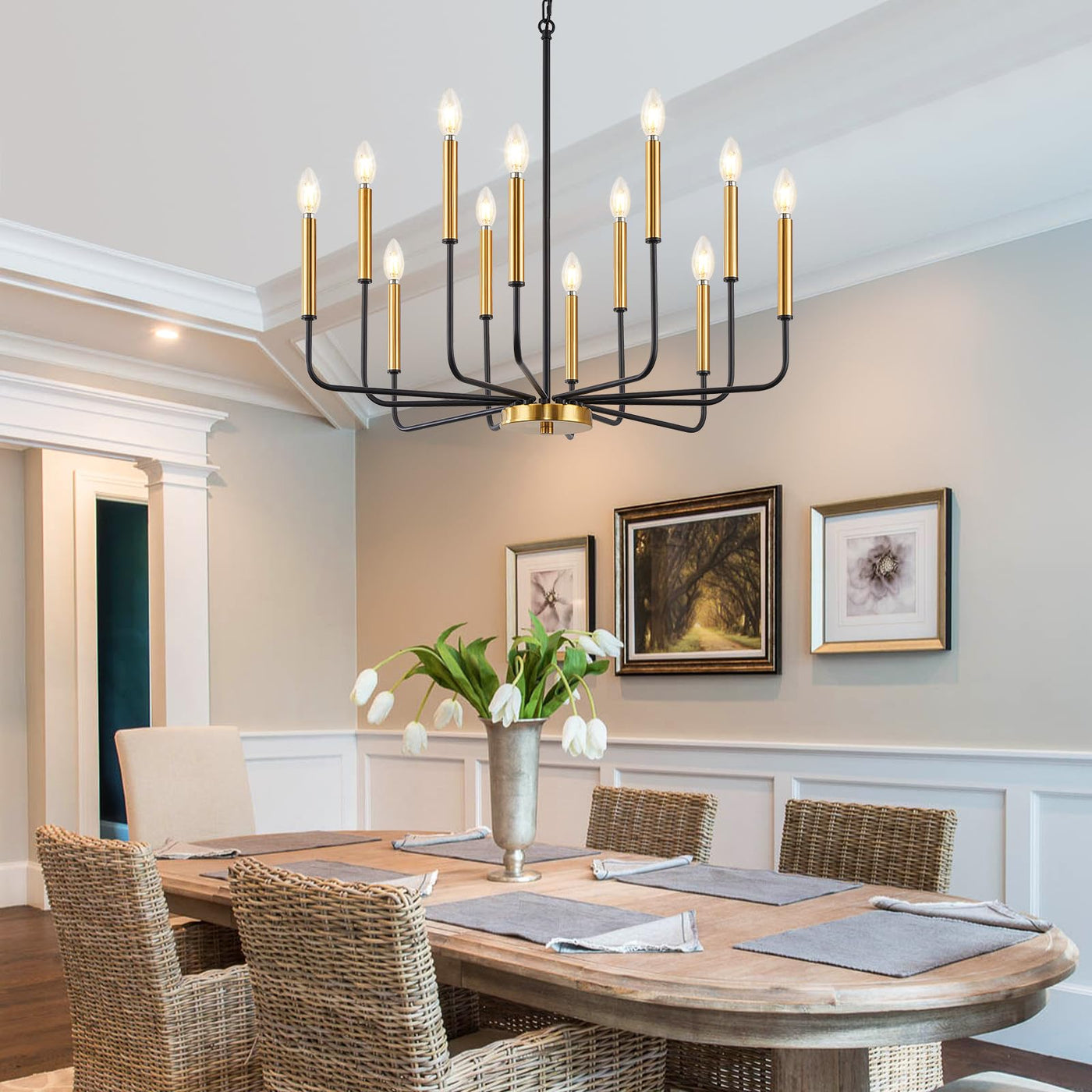Zuyurt 12-Light Black And Gold Chandelier, Modern Farmhouse Chandelier For Dining Room Hanging Lighting Fixture, Metal Candle Chandelier With Chain For Living Room, Kitchen, Entryway, Foyer, Stairs