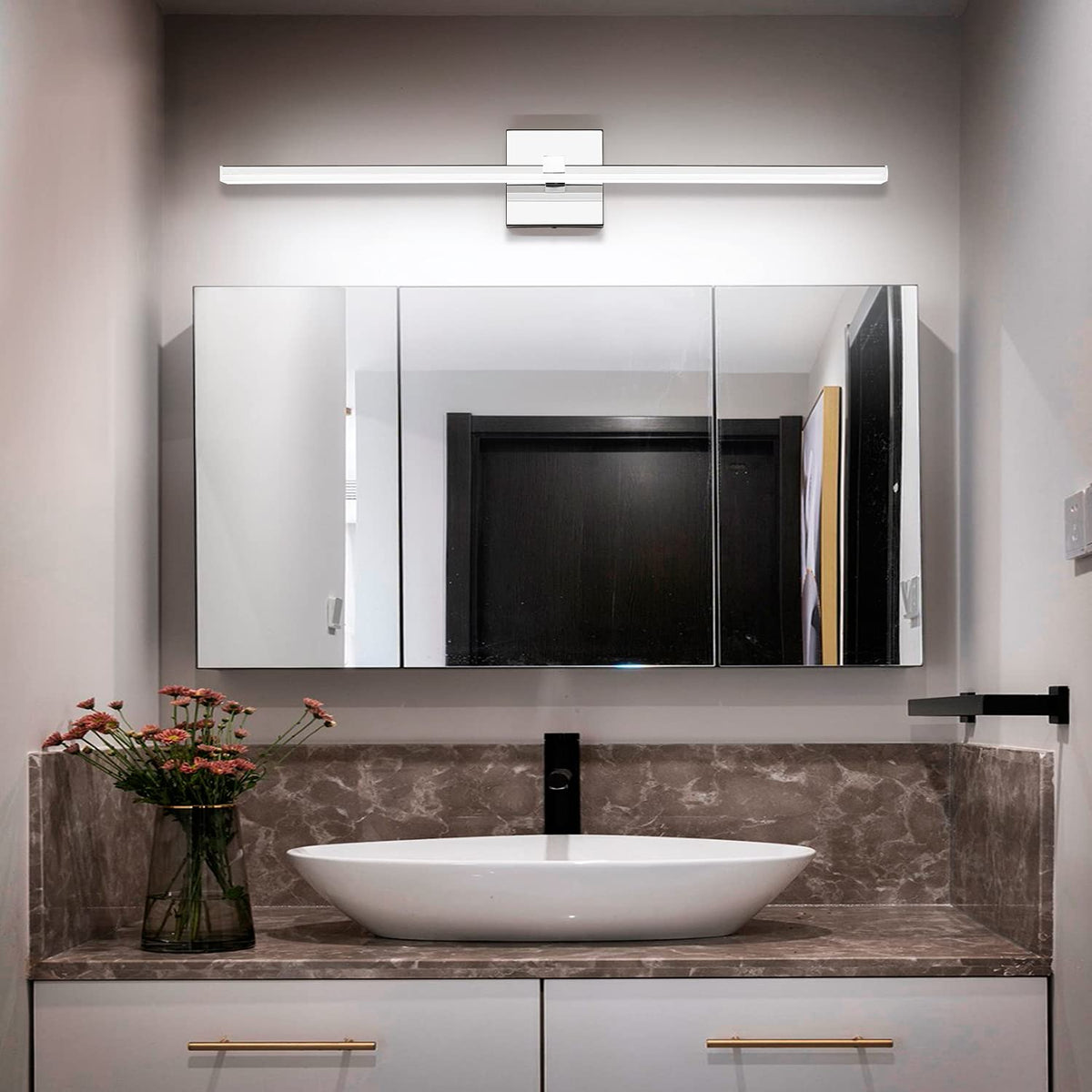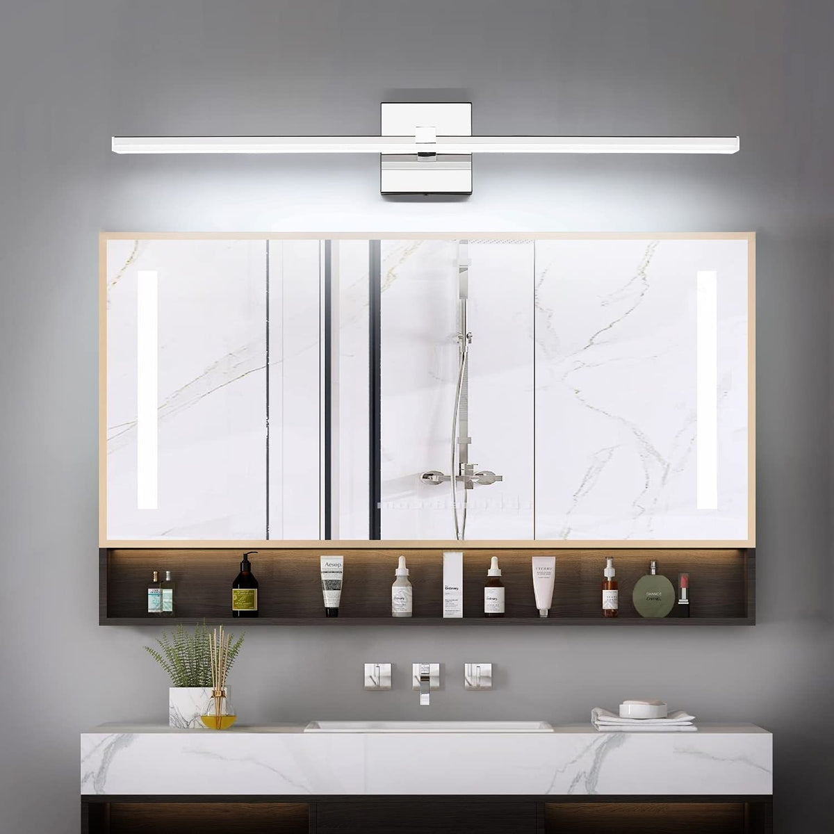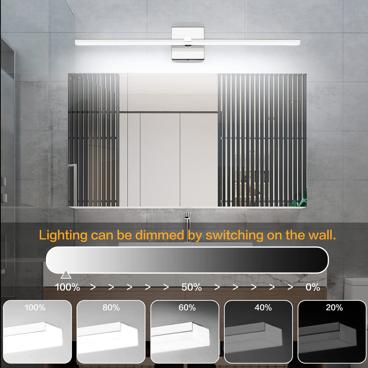 - **Dimmable & Flicker-Free**: The 22W vanity light offers smooth dimmable capabilities, allowing you to effortlessly adjust the brightness from 0% to 100% to suit your mood and needs. Enjoy a flicker-free experience while you relax or get ready.