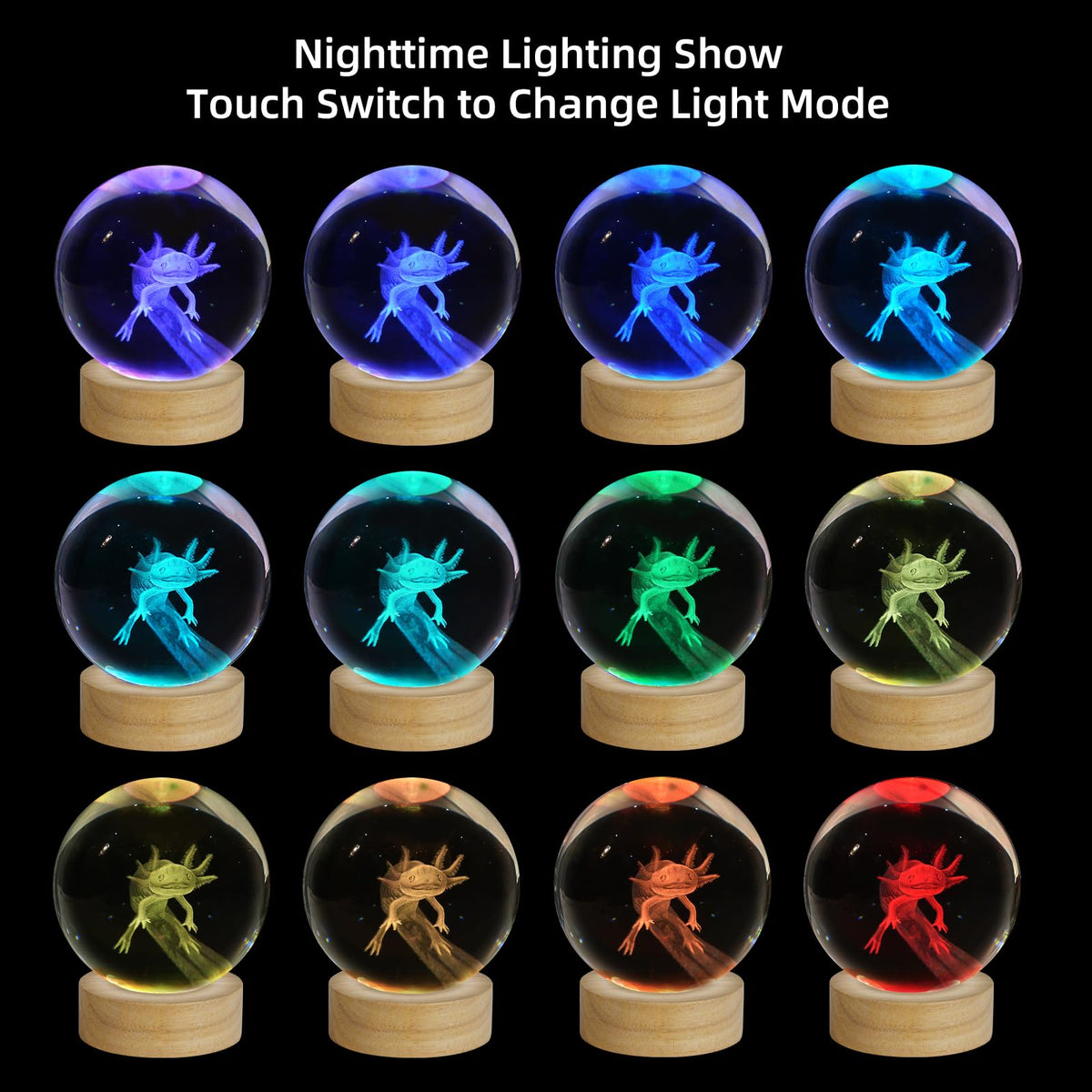 ZXBLAQ 3D Axolotl Crystal Ball Night Light, Glass, 3.15 Inch, 16 Color LED, Wooden Base, Axolotl-1