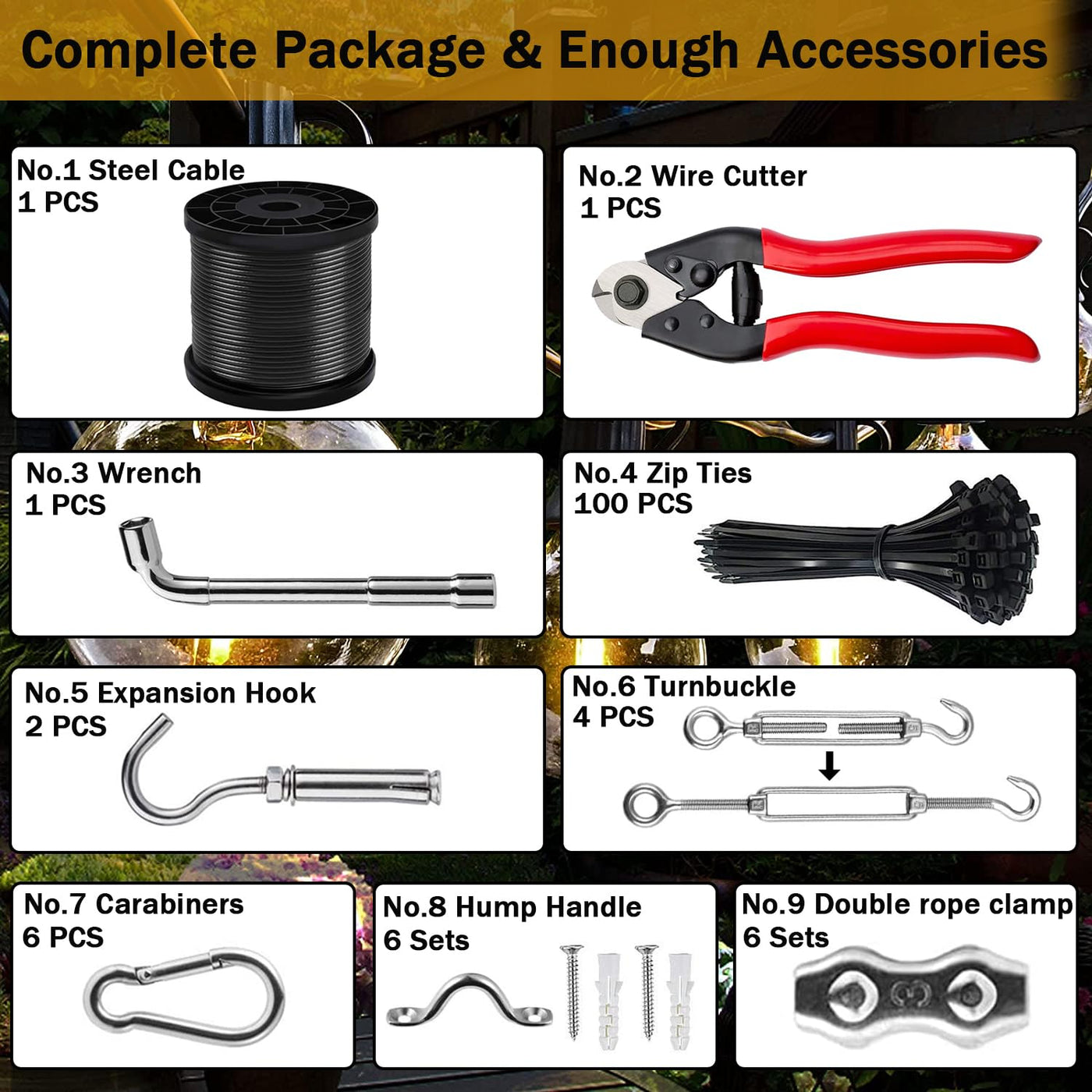 Introducing the zycBernoi String Light Suspension Kit, a complete and upgraded solution for hanging your patio string lights. This kit is made with superior quality 304 stainless steel and nylon coated wire rope, ensuring durability and resistance to rust. The 7x7 braided cable has a static break strength of 480lbs, making it ideal for large open areas and heavy-duty string lights. The kit is multipurpose, suitable for various lighting suspension types, and can be used both indoors and outdoors. With easy installation, detailed specifications, and complete accessories, your outdoor light can look professional. The zycBernoi String Light Suspension Kit comes with a cable cutter, and is waterproof, LED, remote-controlled, and has a gu10 bulb base with an a19 shape size. It measures 4 inches in width, 8 inches in length, and 4 inches in height. We offer a 3-year warranty and technical support for any questions.