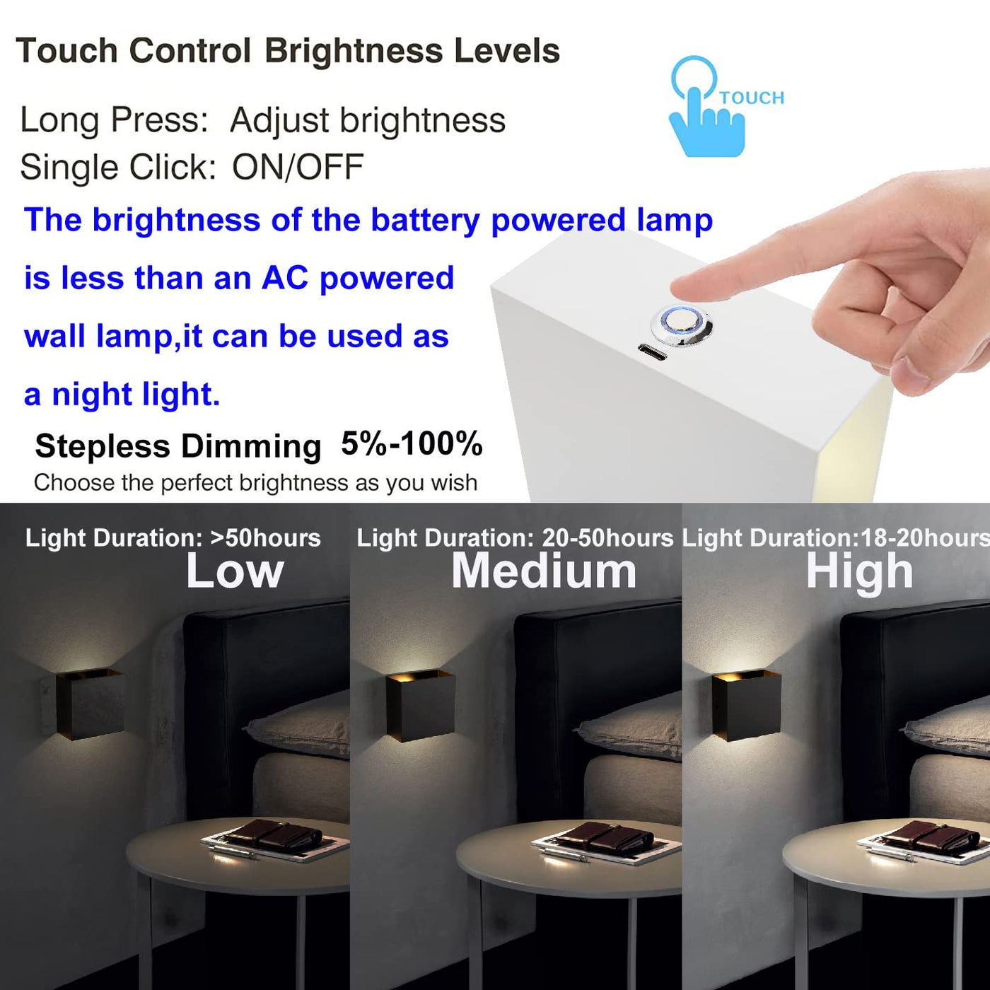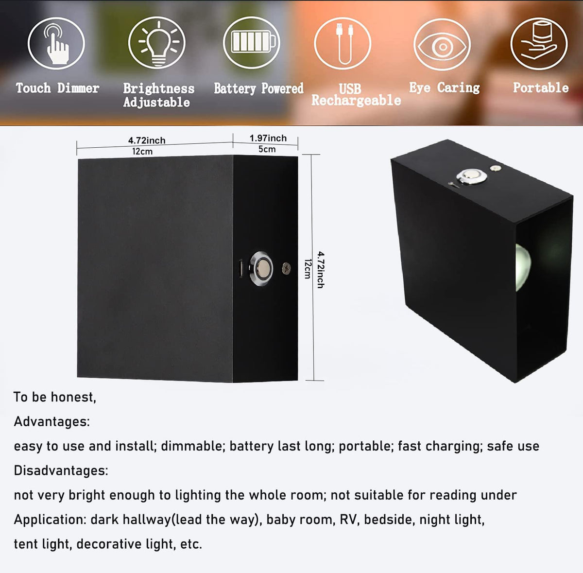 This lamp is battery powered, the brightness can not be compared with Ac powered wall lamp, it can be used as a small night light, has a good decorative effectThis wall light comes with a strong 3M adhesive base You can stick it on anywhere you want, such as living room, bedroom, bathroom, kitchen, hallway, closet, under cabinet, and dorm You can also hang the the light on the hook according to your needs Its so quickly and conveniently This LED wall light can be an excellent gift for your kids, best friends, family, and others during the holidays and festivals